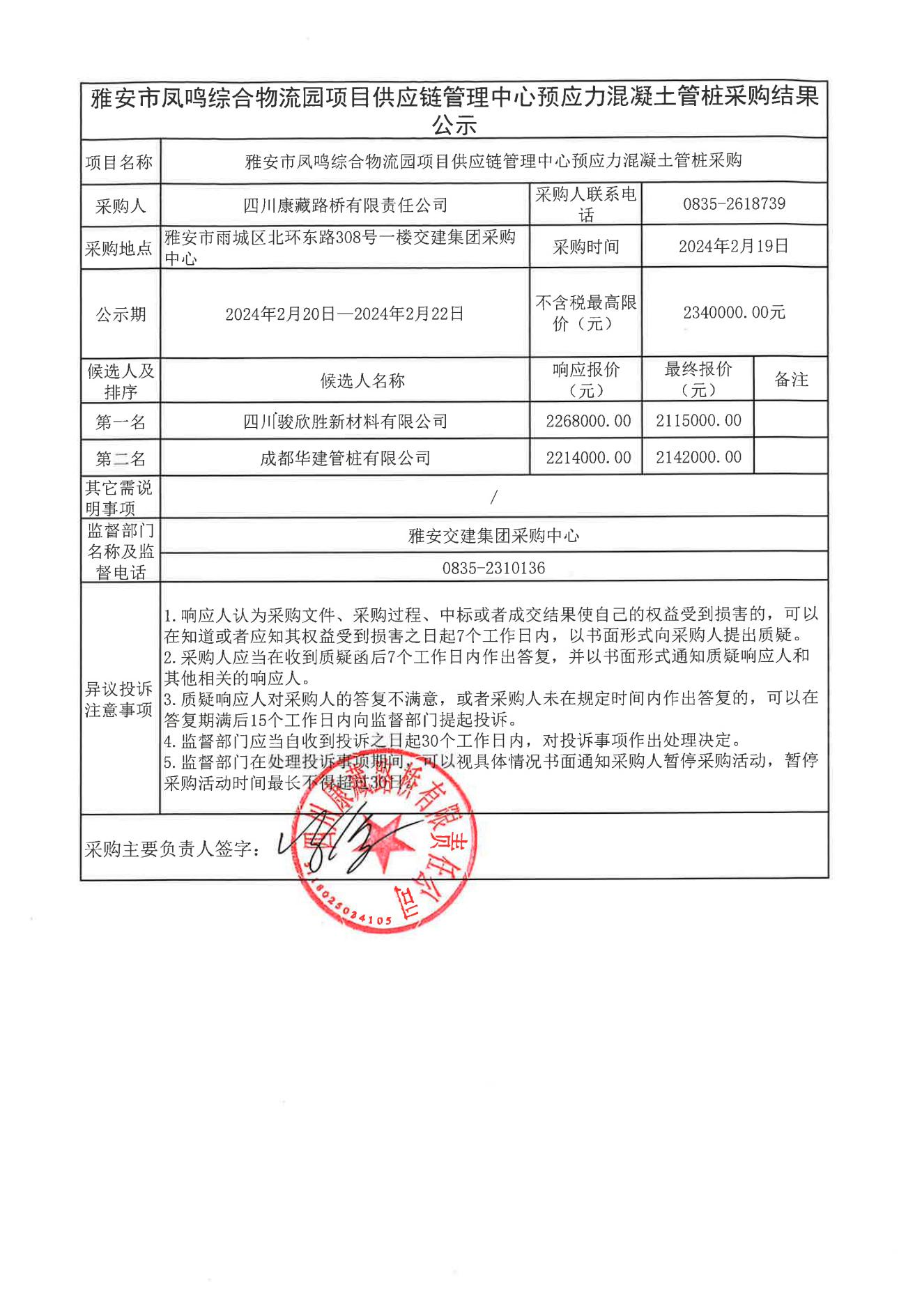 四川康藏路橋有限責(zé)任公司雅安市鳳鳴綜合物流園項(xiàng)目供應(yīng)鏈管理中心預(yù)應(yīng)力混凝土管樁采購(gòu)結(jié)果公示