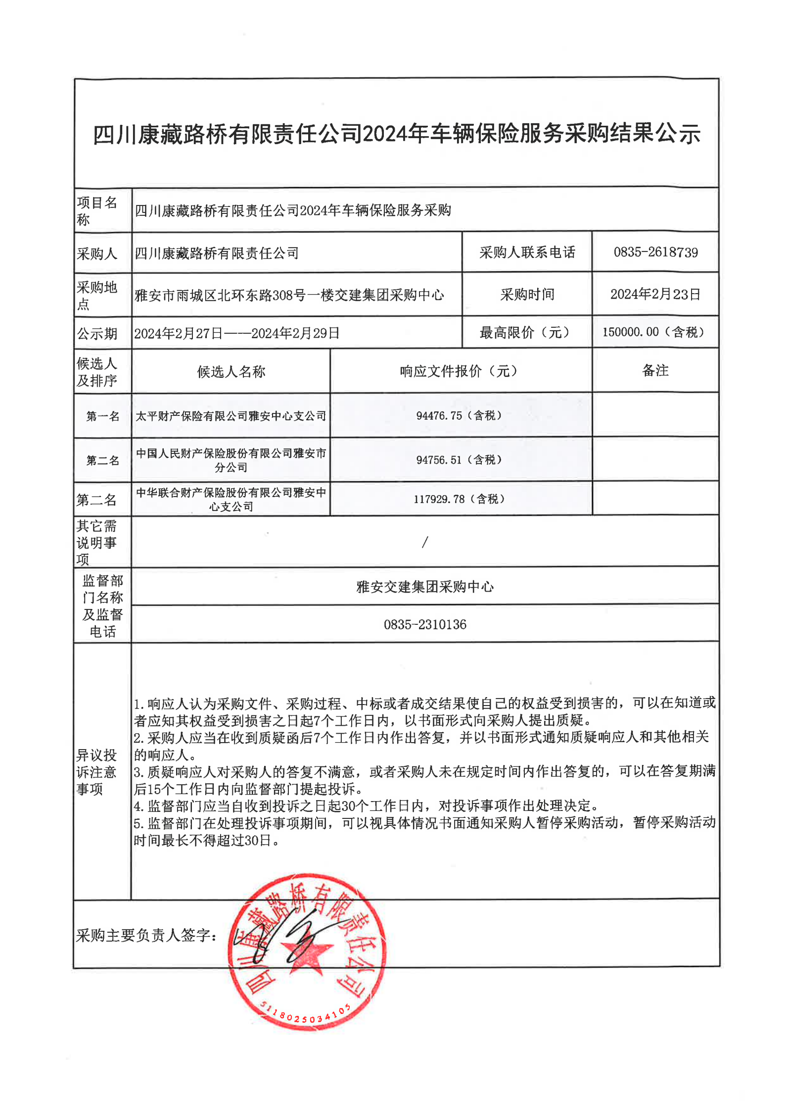 四川康藏路橋有限責任公司2024年車輛保險服務采購結果公示