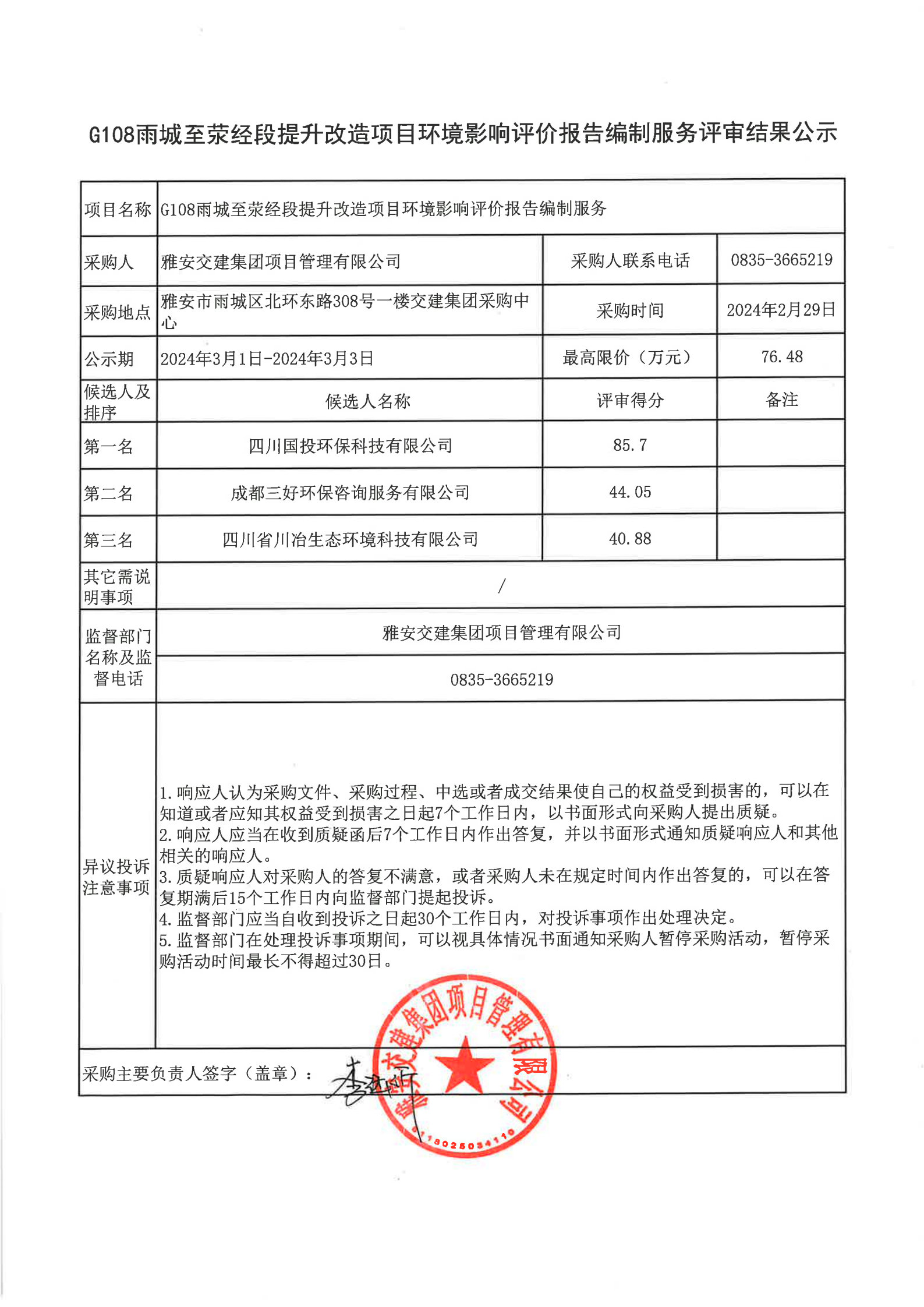雅安交建集團(tuán)項(xiàng)目管理有限公司G108雨城至滎經(jīng)段提升改造項(xiàng)目環(huán)境影響評價(jià)報(bào)告編制服務(wù)評審結(jié)果公示