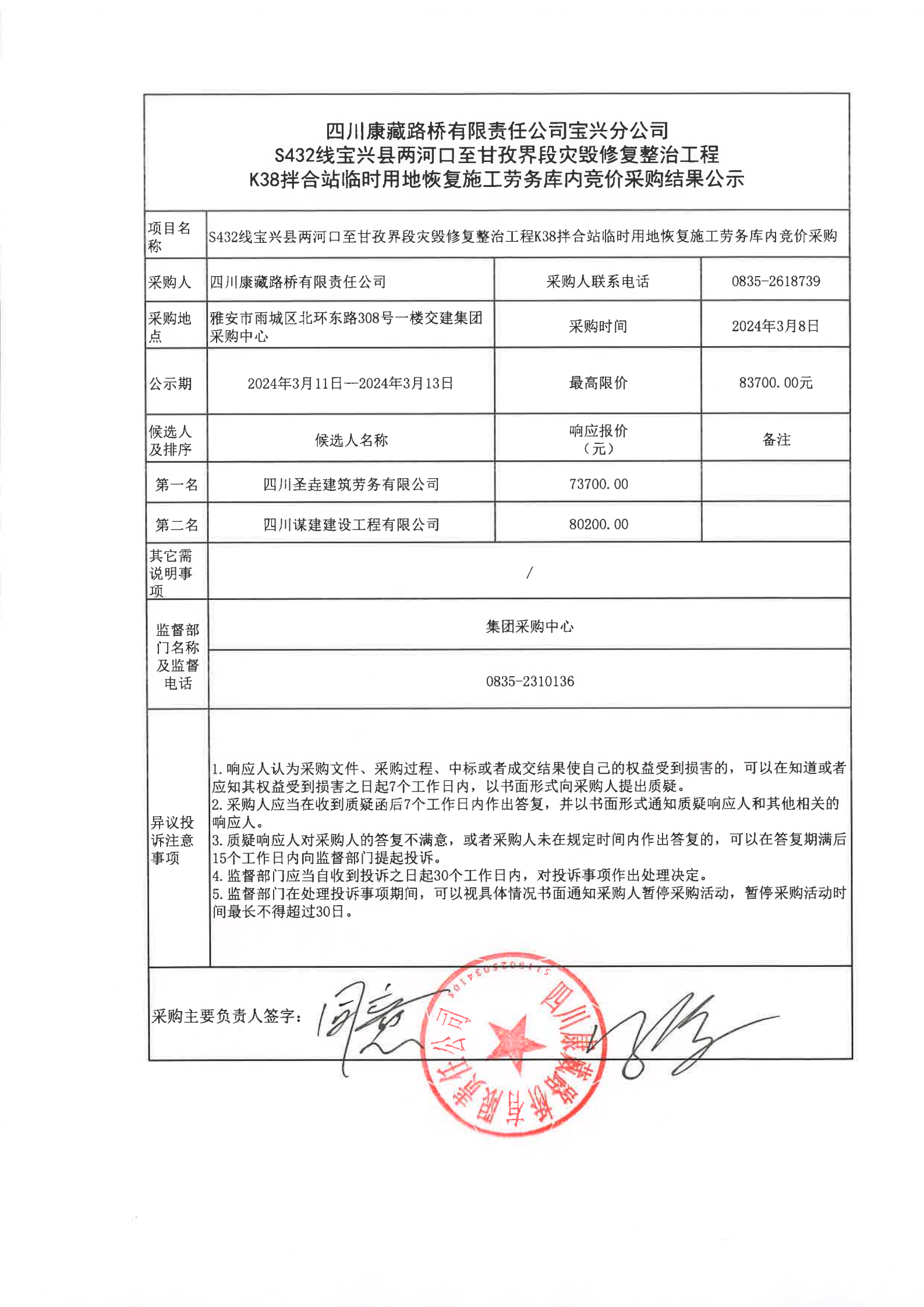 四川康藏路橋有限責任公司寶興分公司S432線寶興縣兩河口至甘孜界段災毀修復整治工程K38拌合站臨時用地恢復施工勞務庫內競價采購結果公示