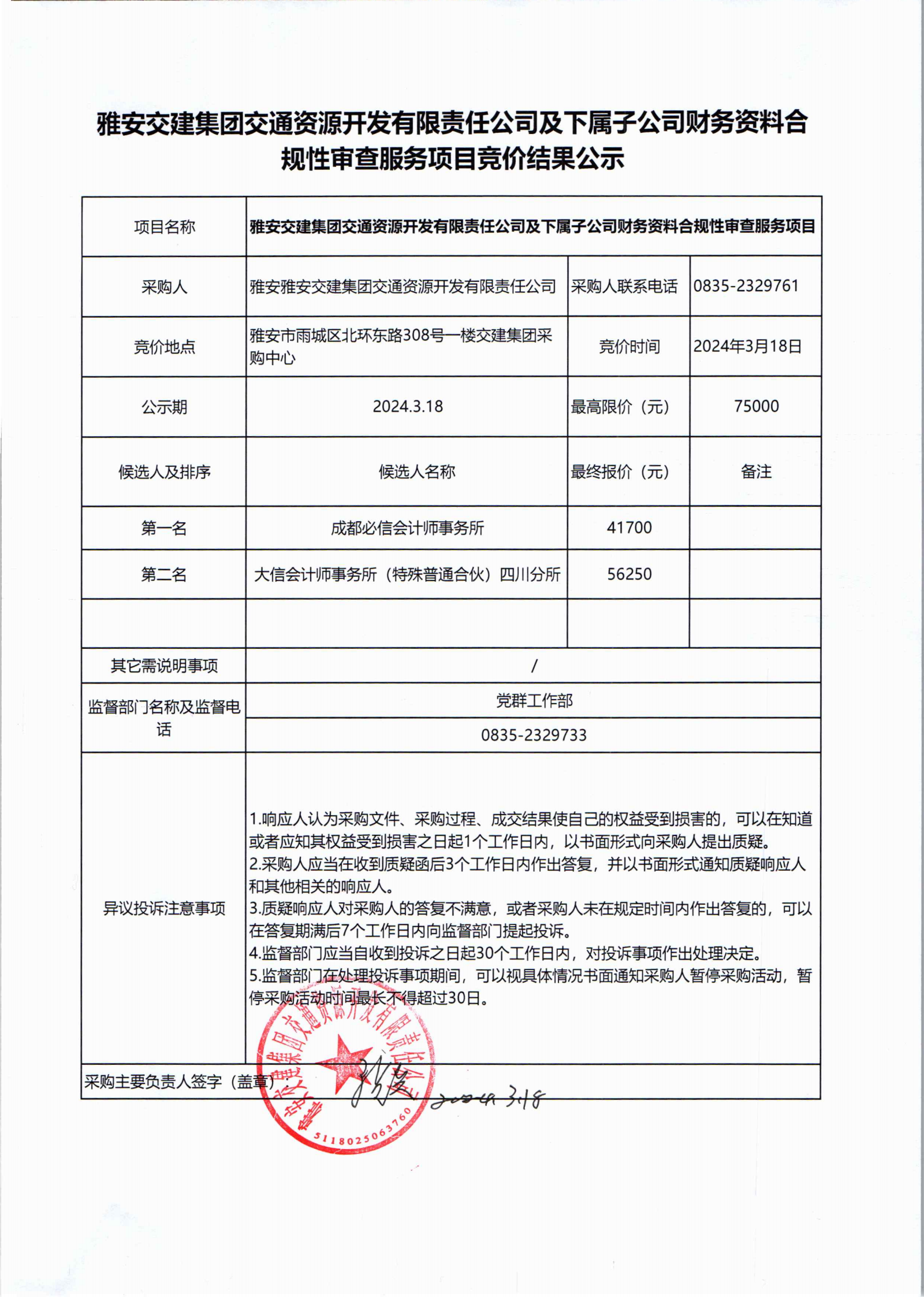 雅安交建集團交通資源開發(fā)有限責任公司及下屬子公司財務(wù)資料合規(guī)性審查服務(wù)項目競價結(jié)果公示