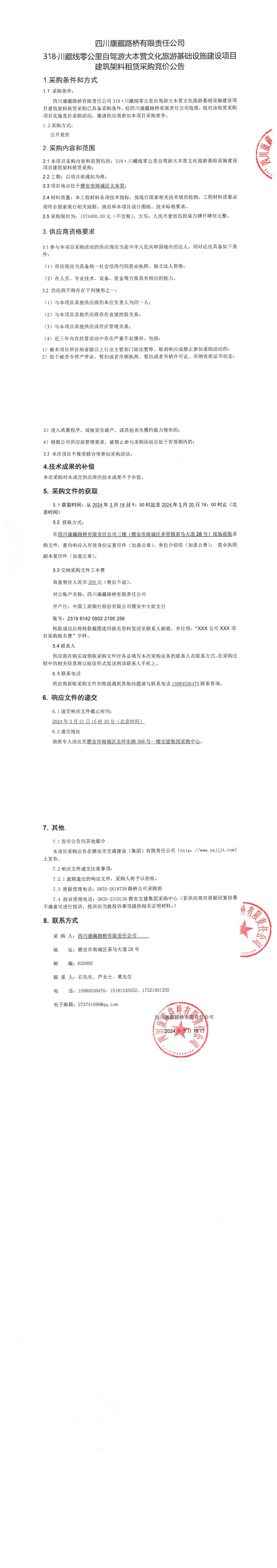 四川康藏路橋有限責(zé)任公司318·川藏線零公里自駕游大本營文化旅游基礎(chǔ)設(shè)施建設(shè)項目建筑架料采購公告
