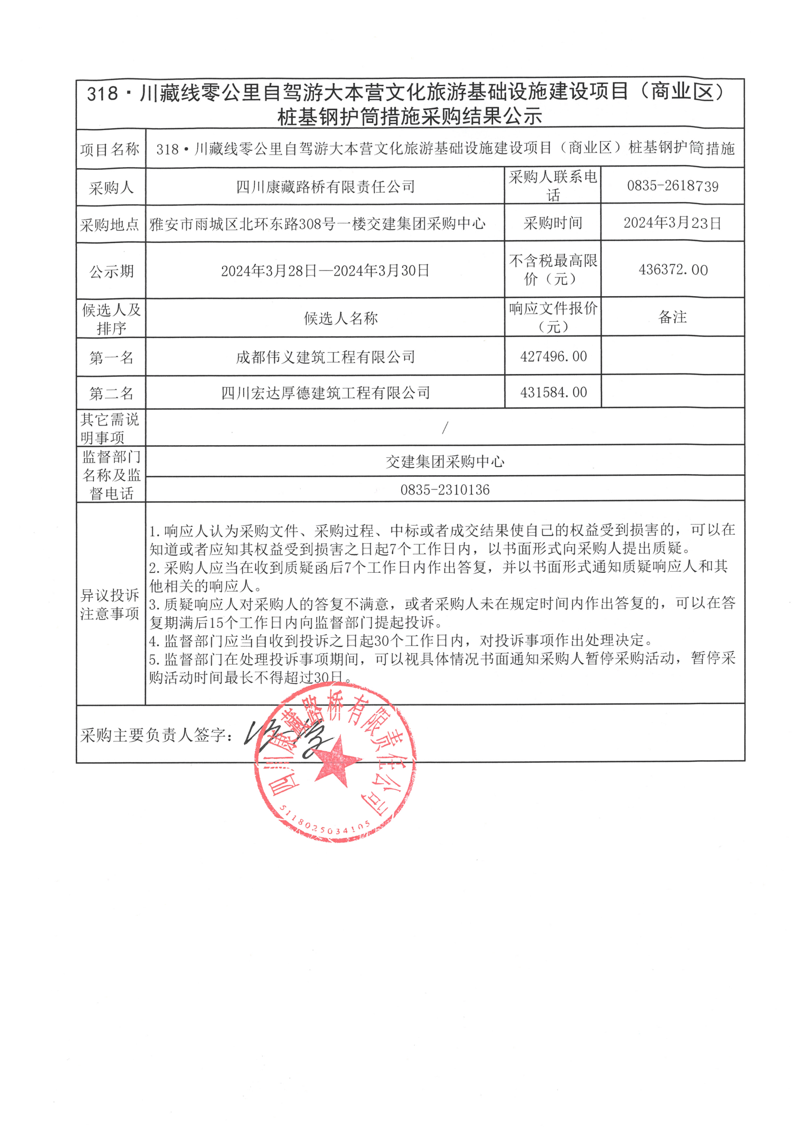 四川康藏路橋有限責(zé)任公司318·川藏公路零公里自駕游大本營文化旅游基礎(chǔ)設(shè)施建設(shè)項目(商業(yè)區(qū))樁基鋼護筒措施采購結(jié)果公示