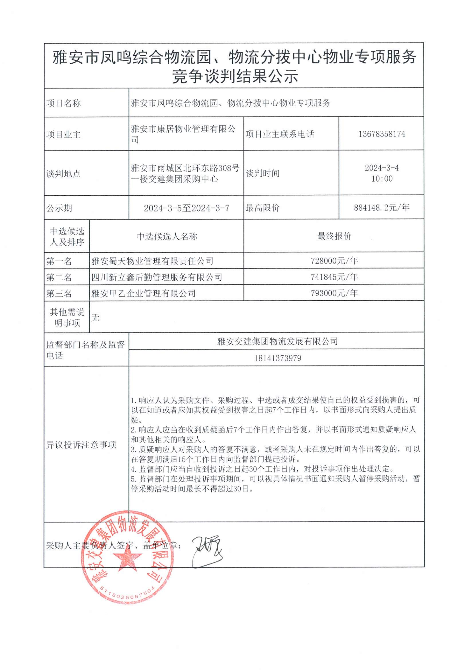 雅安市康居物業(yè)管理有限公司雅安市鳳鳴綜合物流園、物流分撥中心物業(yè)專項(xiàng)服務(wù)競(jìng)爭(zhēng)談判結(jié)果公示