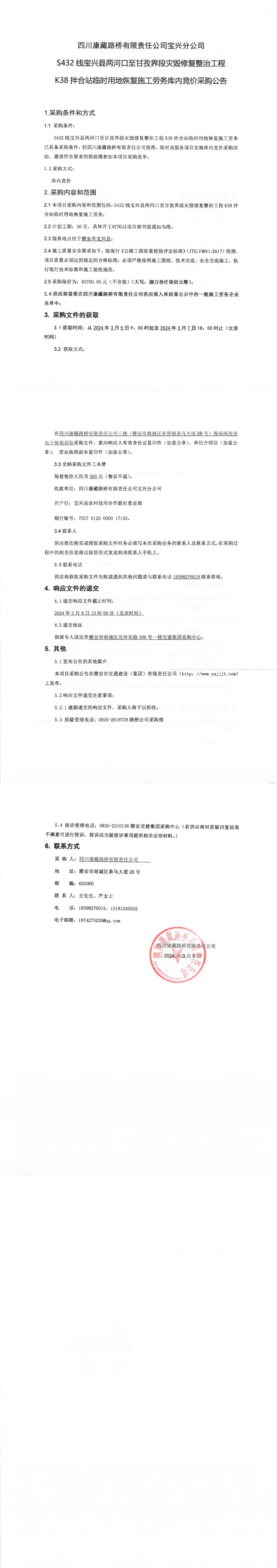 四川康藏路橋有限責(zé)任公司S432線寶興縣兩河口至甘孜界段災(zāi)毀修復(fù)整治工程K38拌合站臨時用地恢復(fù)施工勞務(wù)庫內(nèi)競價采購公告