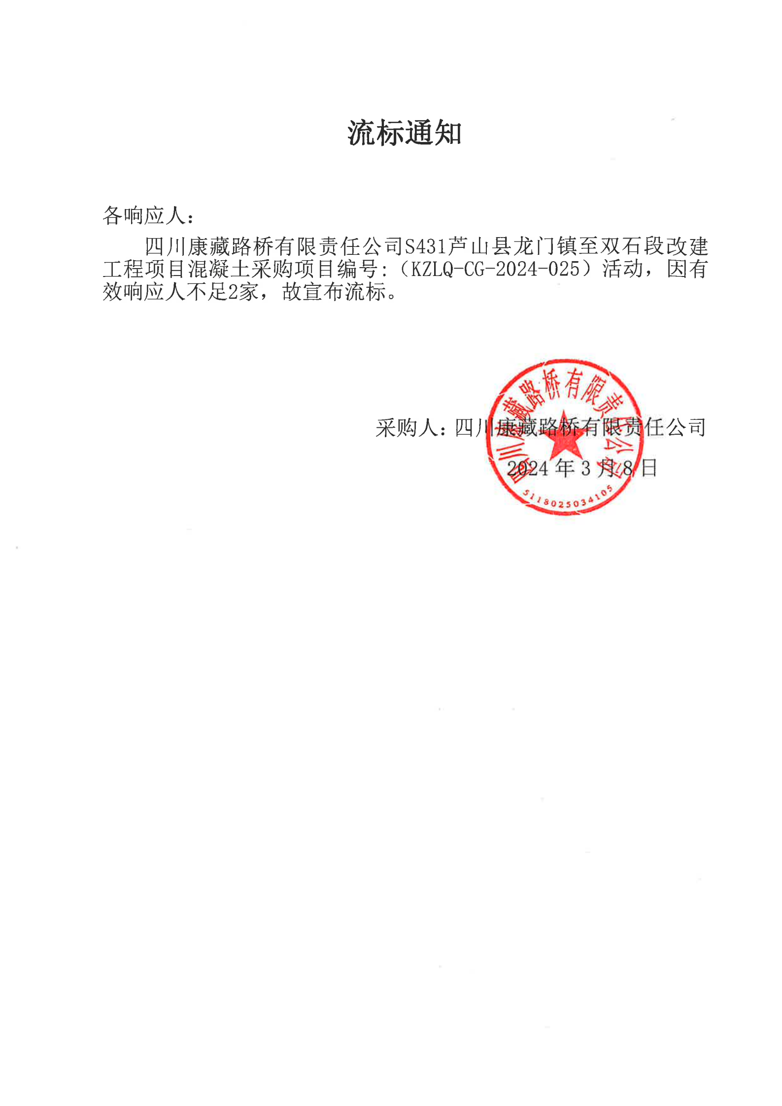 四川康藏路橋有限責(zé)任公司S431蘆山縣龍門鎮(zhèn)至雙石段改建工程項(xiàng)目混凝土采購(gòu)流標(biāo)通知