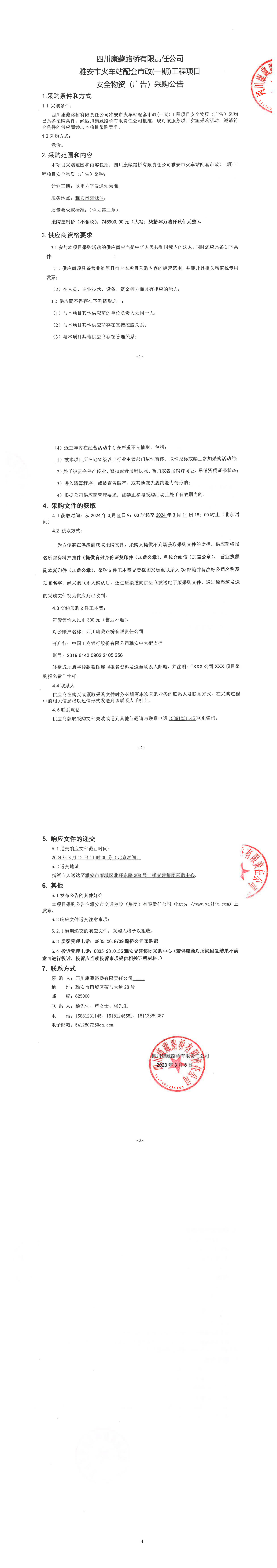 四川康藏路橋有限責(zé)任公司雅安市火車站配套市政(一期)工程項(xiàng)目安全物質(zhì)(廣告)采購(gòu)公告