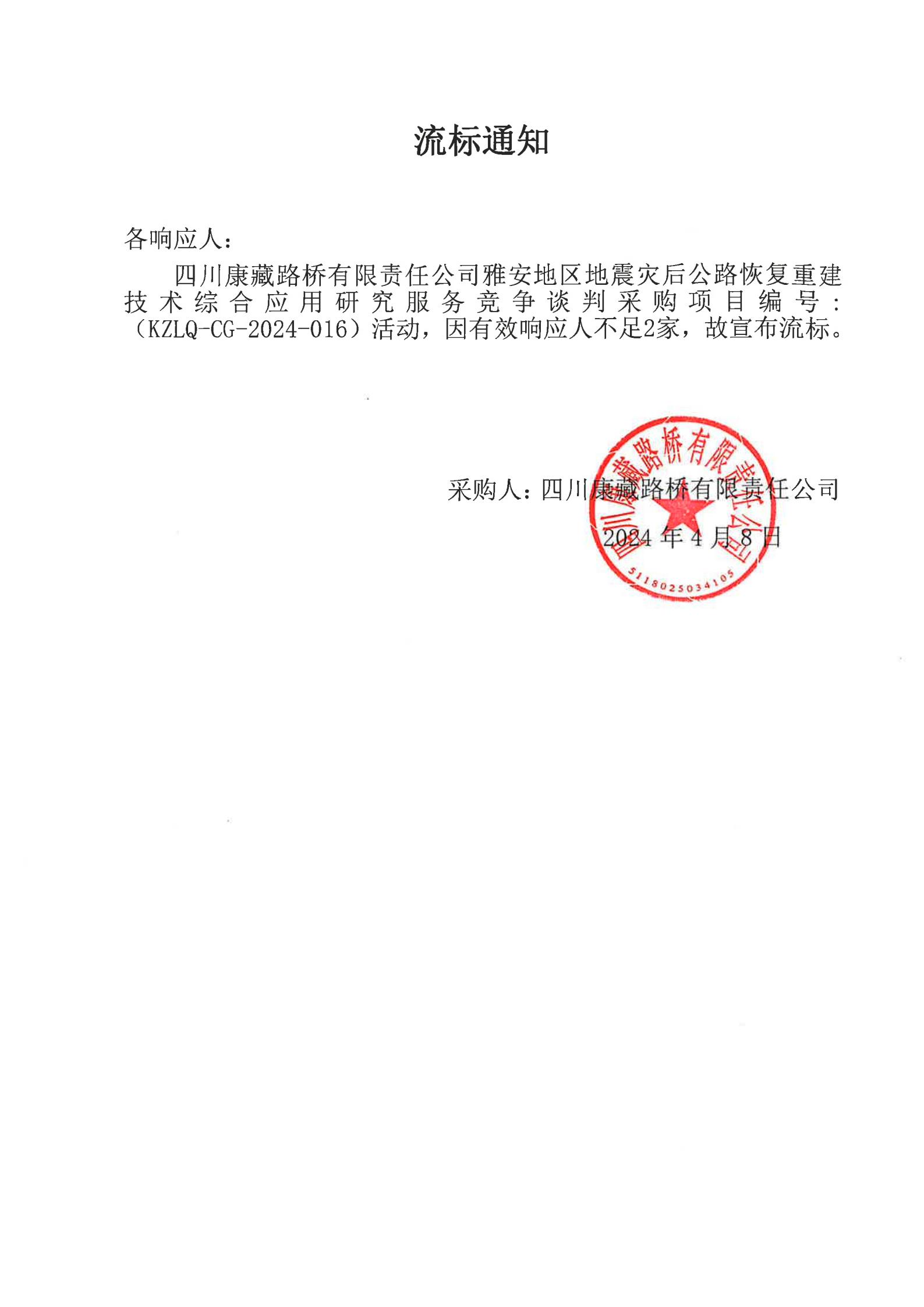 四川康藏路橋有限責任公司雅安地區(qū)地震災后公路恢復重建技術(shù)綜合應(yīng)用研究服務(wù)流標通知