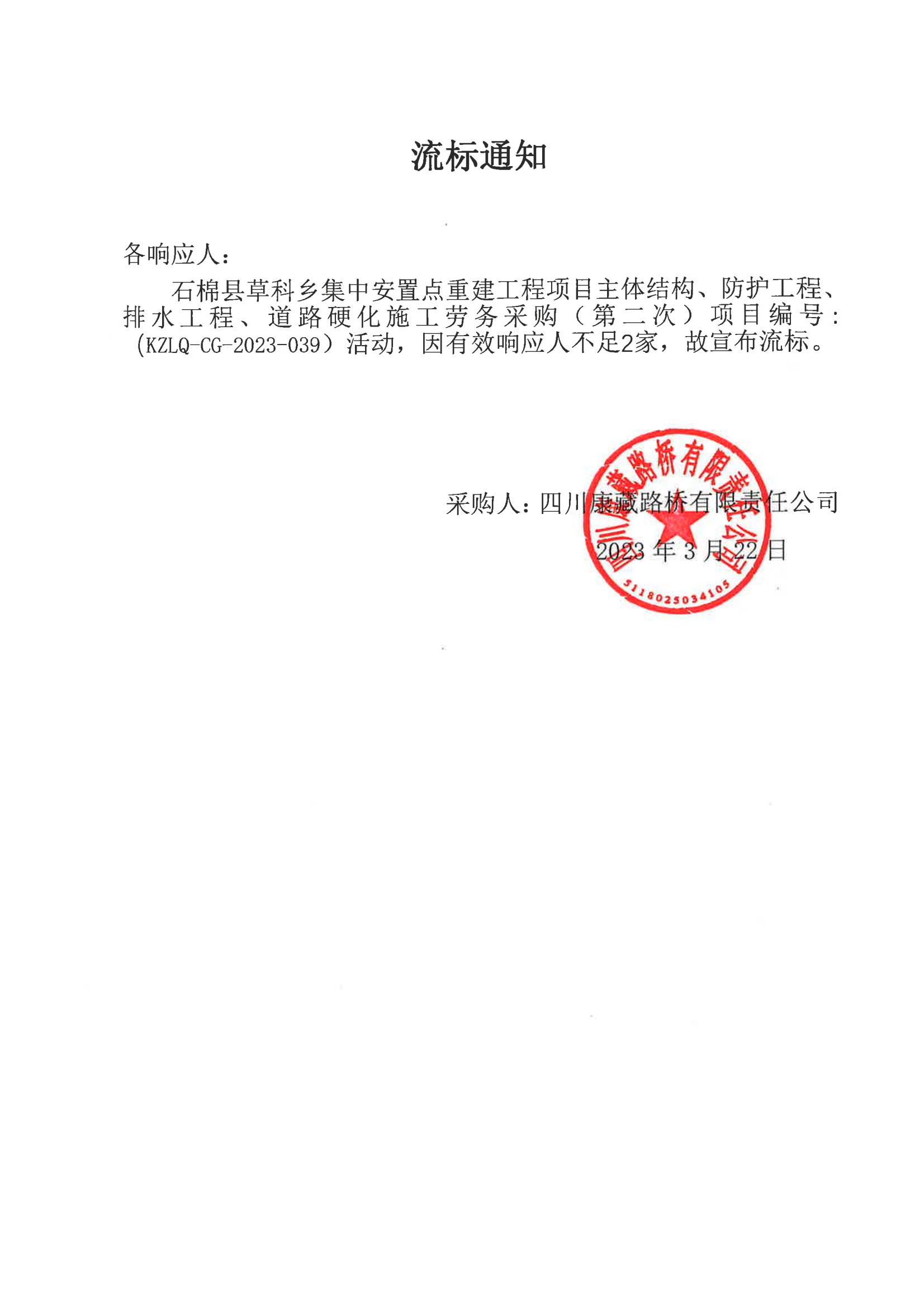 四川康藏路橋有限責(zé)任公司石棉草科鄉(xiāng)集中安置點(diǎn)重建工程項(xiàng)目主體結(jié)構(gòu)、防護(hù)工程、排水工程、道路硬化施工勞務(wù)采購流標(biāo)通知(第二次)