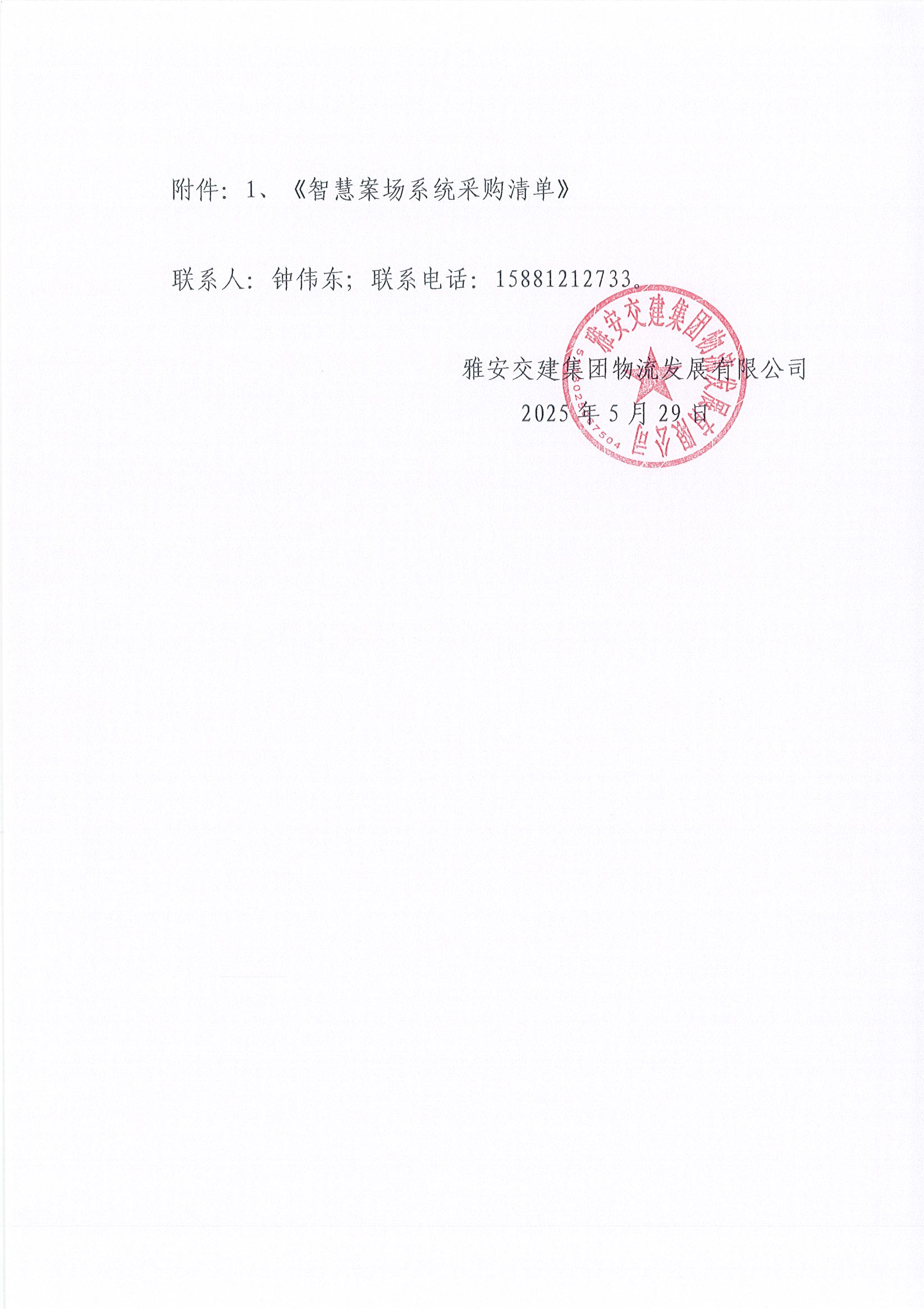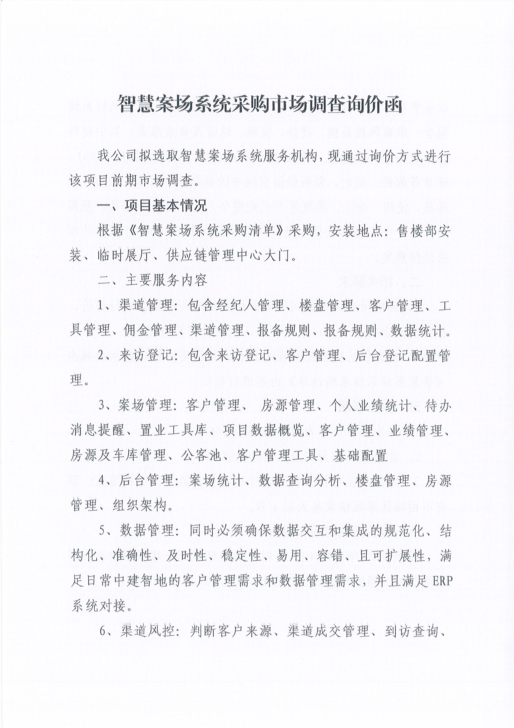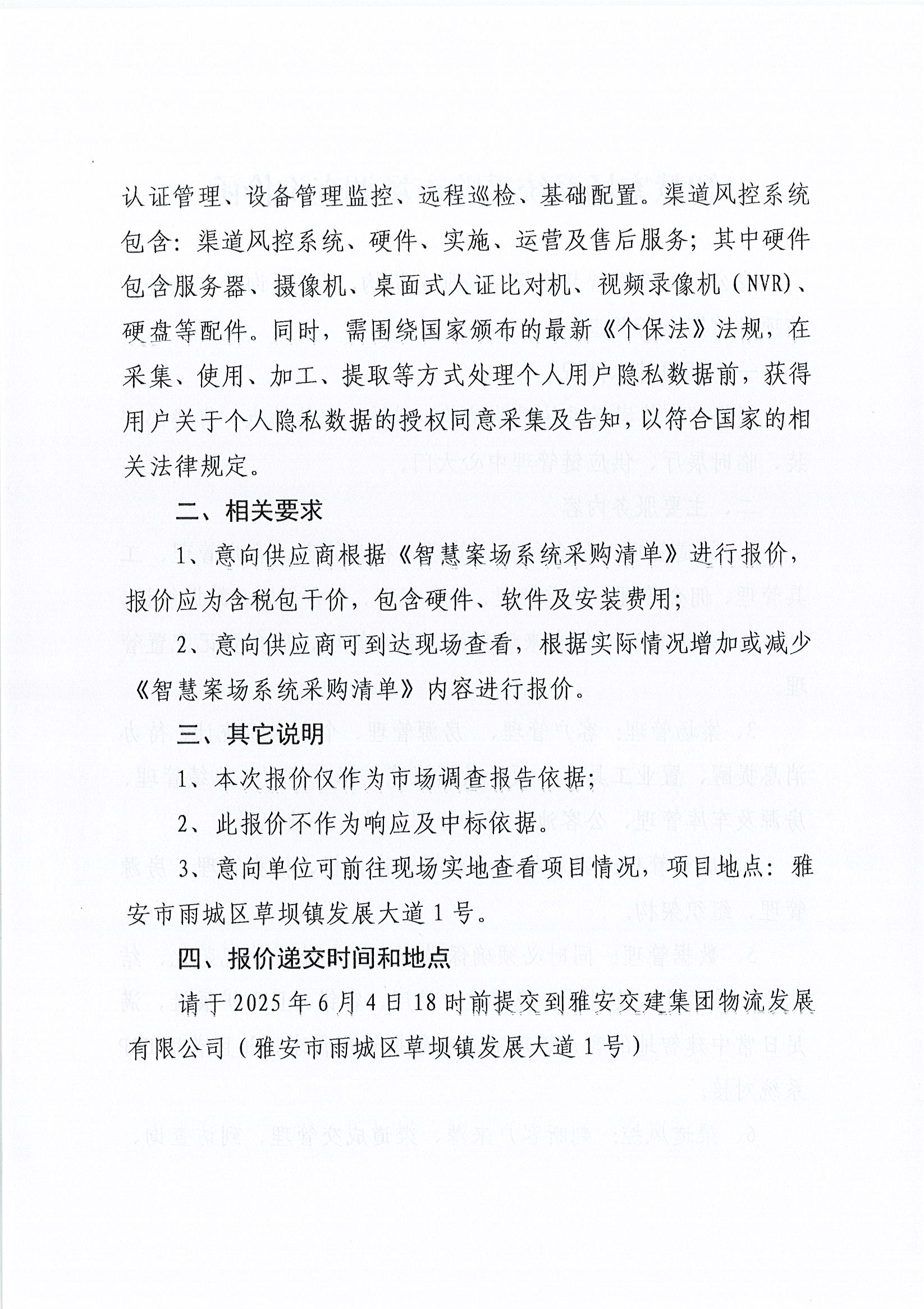 雅安交建集團物流發(fā)展有限公司智慧案場系統(tǒng)采購市場調(diào)查詢價函