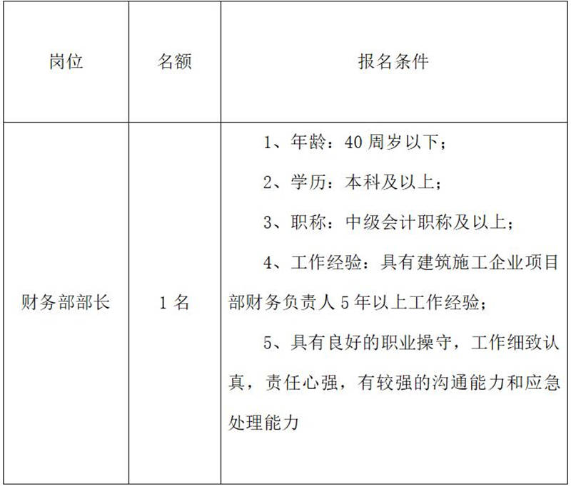 雅安交建集團(tuán)路橋有限責(zé)任公司是雅安市交通建設(shè)(集團(tuán))有限責(zé)任公司下屬子公司,主要從事道路、橋梁修建。現(xiàn)根據(jù)公司業(yè)務(wù)發(fā)展需要,擬向社會(huì)公開招聘1名財(cái)務(wù)部部長(zhǎng),現(xiàn)將有關(guān)事項(xiàng)公告如下:
