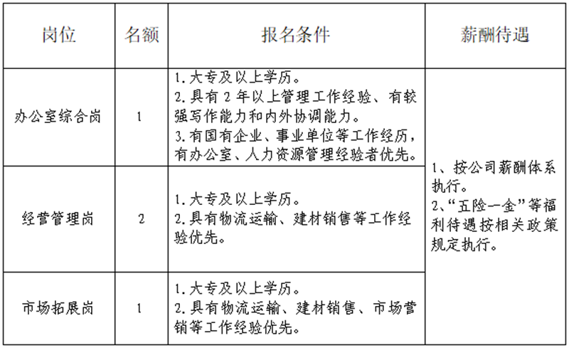 雅安交建集團運通貿(mào)易有限公司是雅安市交通建設(集團)有限責任公司下屬子公司。主要從事普通貨運、建材銷售、供應鏈管理、貨運代理、貨運信息咨詢服務、倉儲配送服務等工作,F(xiàn)根據(jù)公司業(yè)務發(fā)展需要,決定招聘4名工作人員,現(xiàn)將有關(guān)事項公告如下: