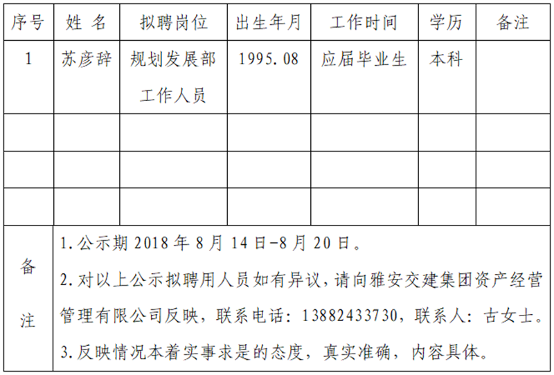 通過公開報名、資格審查、筆試、面試等程序,經(jīng)雅安交建集團(tuán)資產(chǎn)經(jīng)營管理有限公司研究擇優(yōu)確定以下