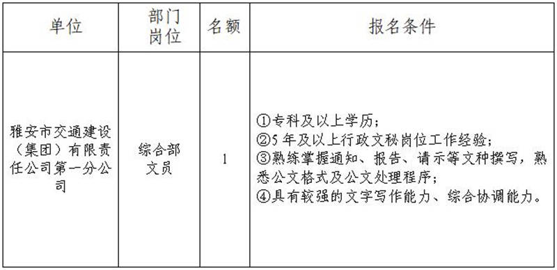 根據(jù)發(fā)展需要,決定面向社會公開招聘雅安市交通建設(shè)(集團)有限責(zé)任公司(以下簡稱“雅安交建集團”)所屬分公司工作人員1名,現(xiàn)將有關(guān)事項公告如下: