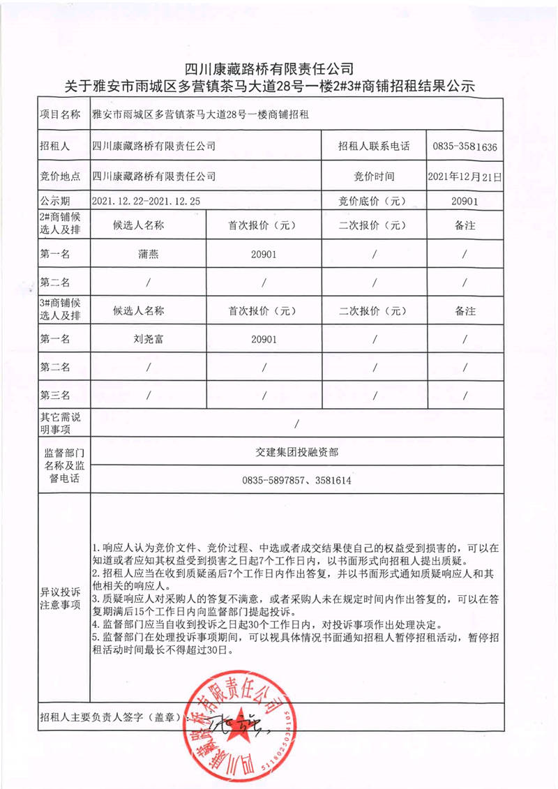 關(guān)于雅安市雨城區(qū)多營鎮(zhèn)茶馬大道28號一樓2#3#商鋪招租結(jié)果公示