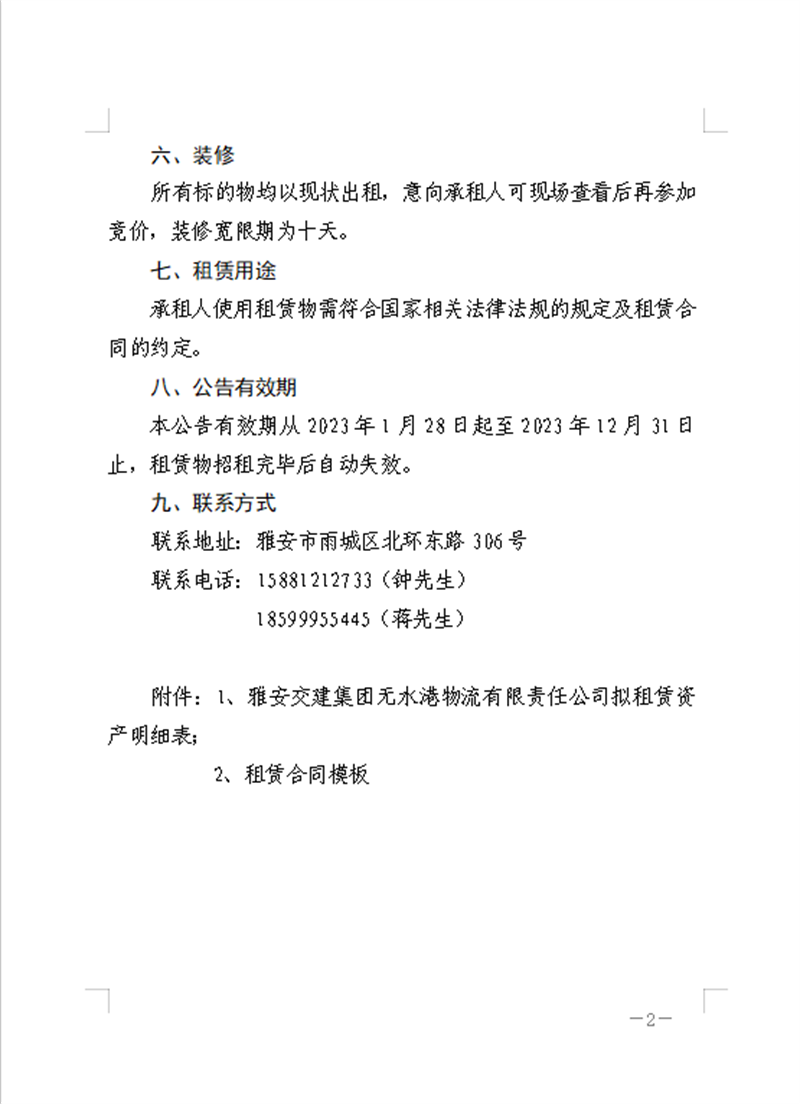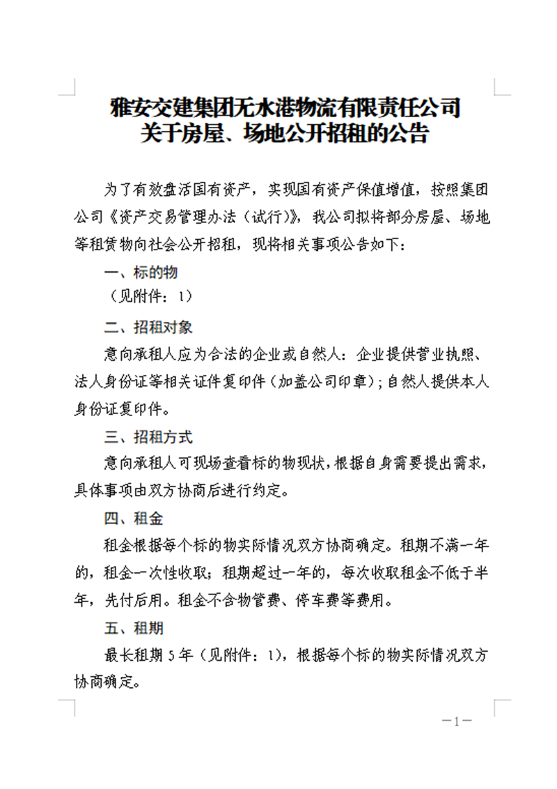 雅安交建集團(tuán)無水港物流有限責(zé)任公司關(guān)于房屋、場(chǎng)地公開招租的公告
