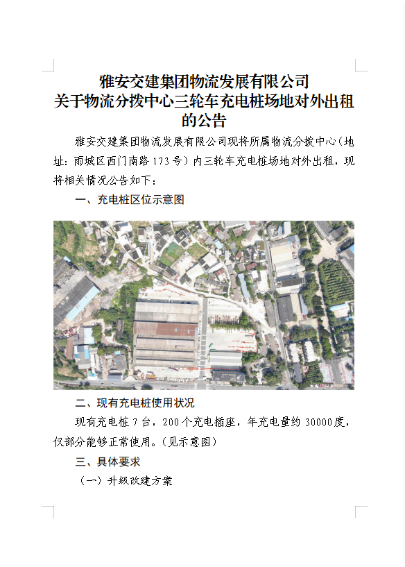 雅安交建集團(tuán)物流發(fā)展有限公司關(guān)于物流分撥中心三輪車充電樁場(chǎng)地對(duì)外出租的公告