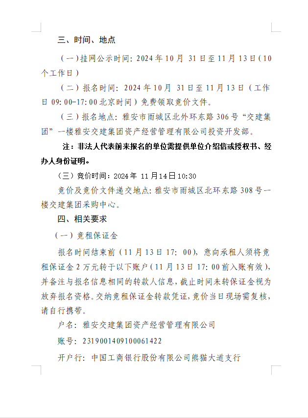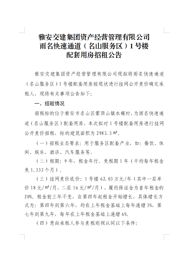 雅安交建集團資產(chǎn)經(jīng)營管理有限公司雨名快速通道(名山服務區(qū))1號樓配套用房招租公告