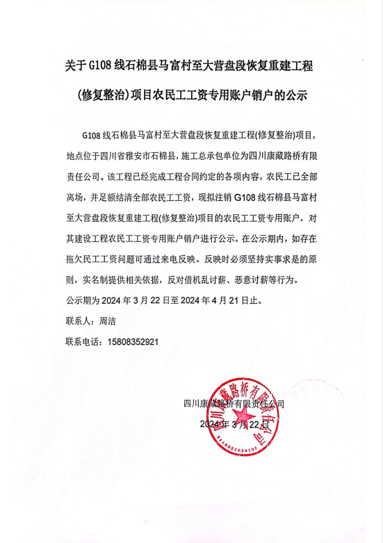 關(guān)于G108線(xiàn)石棉縣馬富村至大營(yíng)盤(pán)段恢復(fù)重建工程(修復(fù)整治)項(xiàng)目農(nóng)民工工資專(zhuān)用賬戶(hù)銷(xiāo)戶(hù)的公示