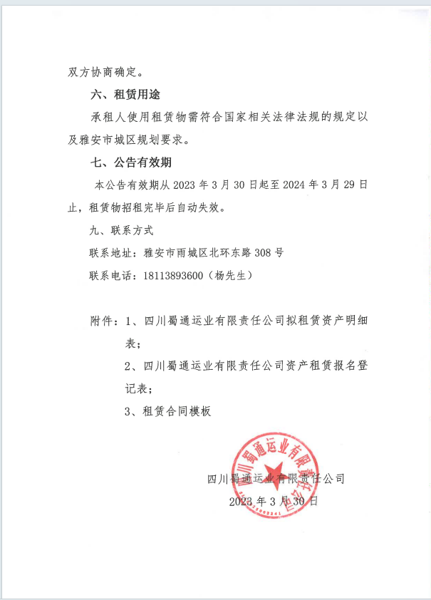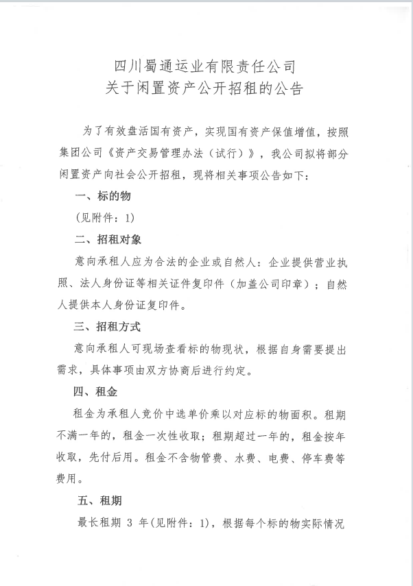 蜀通運(yùn)業(yè)有限責(zé)任公司關(guān)于閑置資產(chǎn)公開(kāi)招租的公告附件