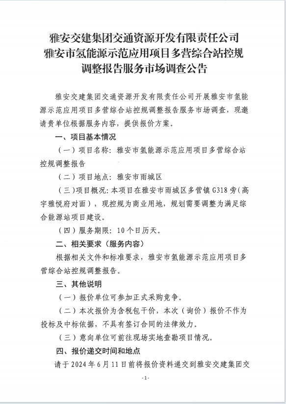 雅安交建集團(tuán)交通資源開發(fā)有限責(zé)任公司雅安市氫能源示范應(yīng)用項(xiàng)目多營綜合站控規(guī)調(diào)整報(bào)告服務(wù)市場調(diào)查公告