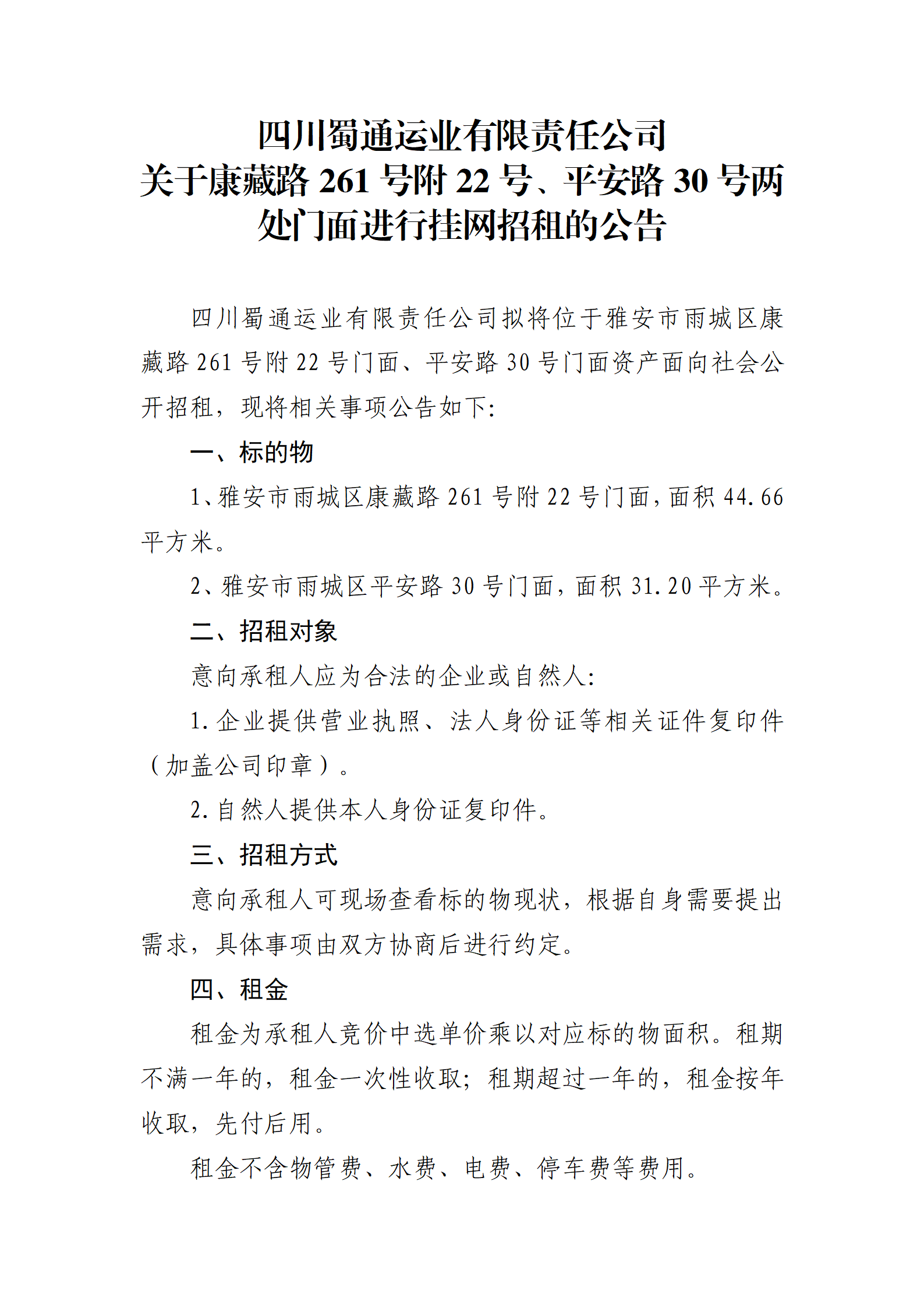 四川蜀通運業(yè)有限責任公司 關于康藏路261號附22號、平安路30號兩處門面進行掛網(wǎng)招租的公告