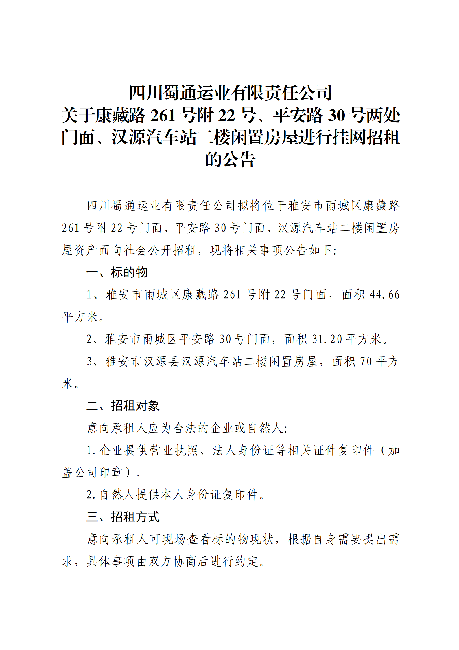 四川蜀通運業(yè)有限責任公司 關于康藏路261號附22號、平安路30號兩處門面、漢源汽車站二樓閑置房屋進行掛網招租的公告