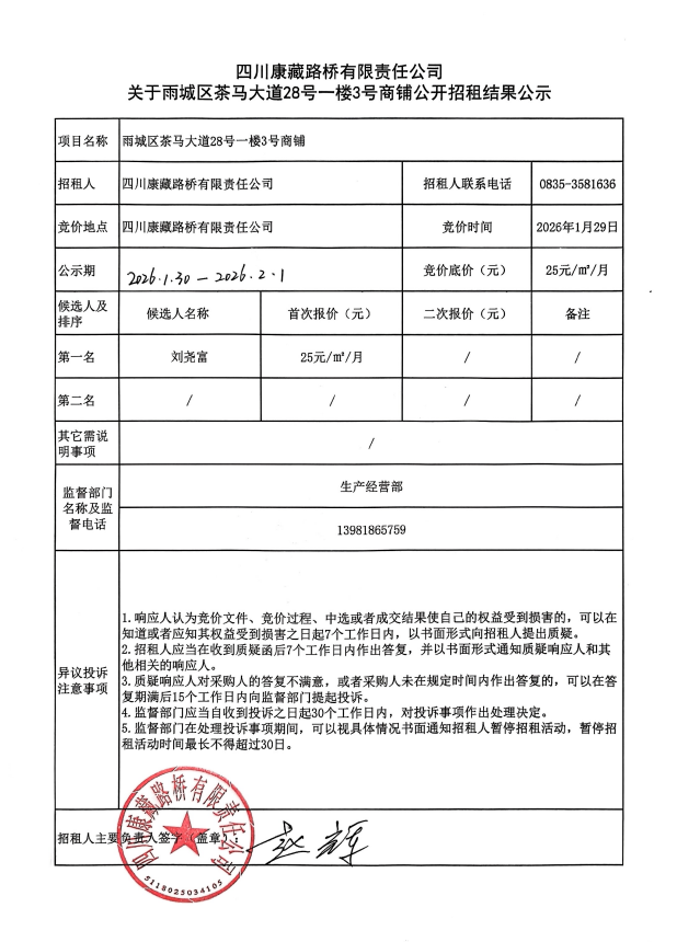 四川康藏路橋有限責(zé)任公司關(guān)于雨城區(qū)茶馬大道28號(hào)一樓3號(hào)商鋪公開招租結(jié)果公示