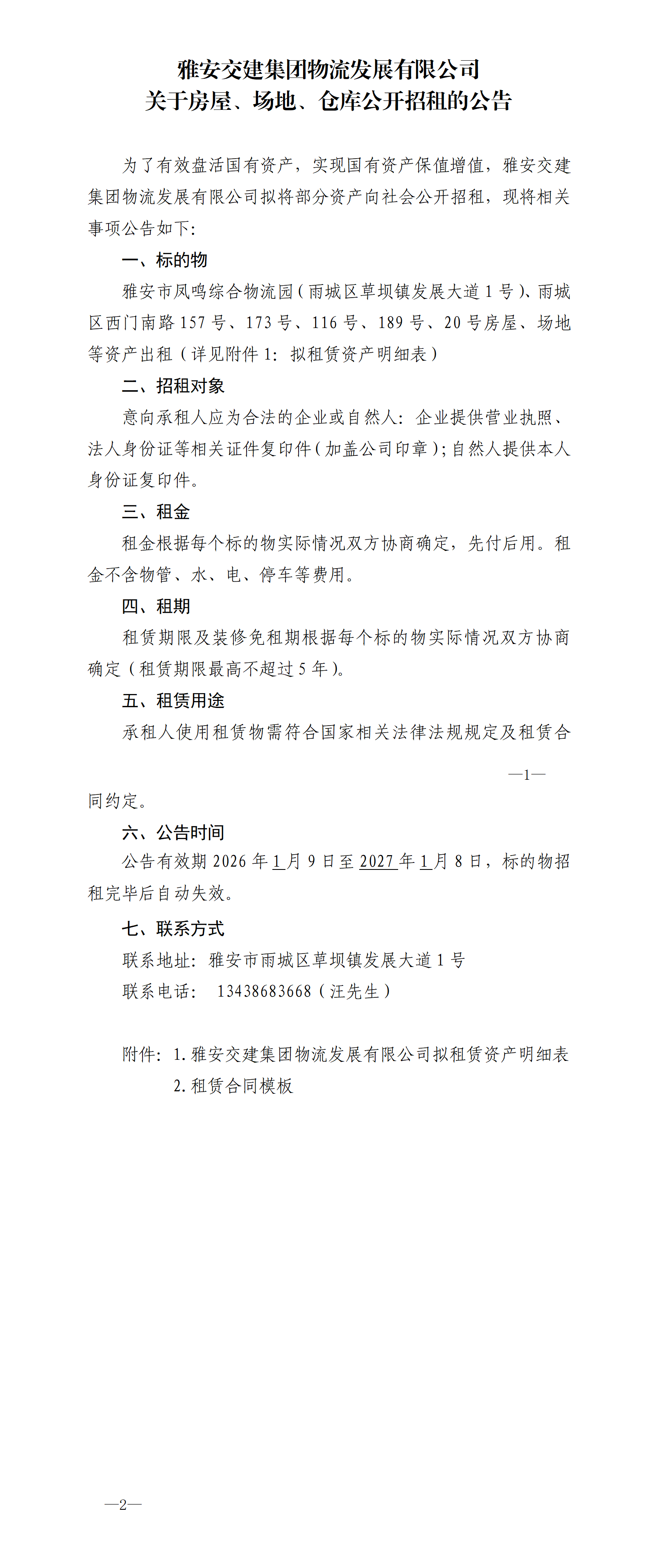 雅安交建集團(tuán)物流發(fā)展有限公司關(guān)于房屋、場地、倉庫公開招租的公告