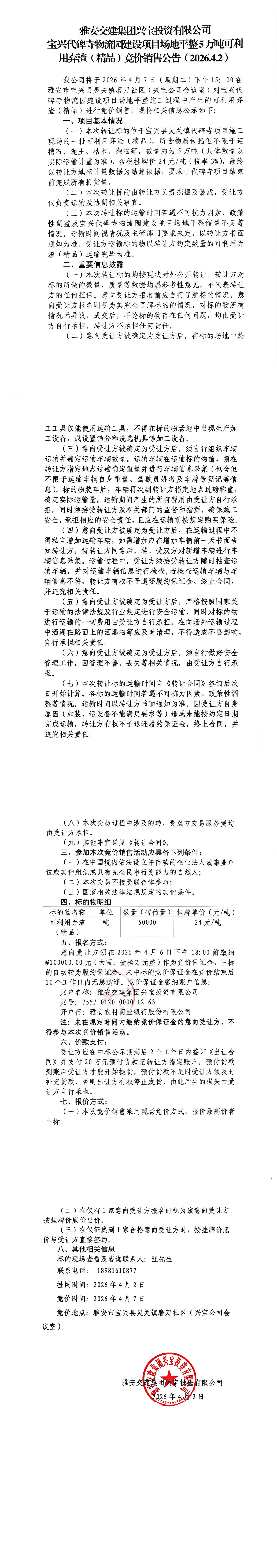 雅安交建集團興寶投資有限公司 寶興代碑寺物流園建設項目場地平整5萬噸可利用棄渣(精品)競價銷售公告