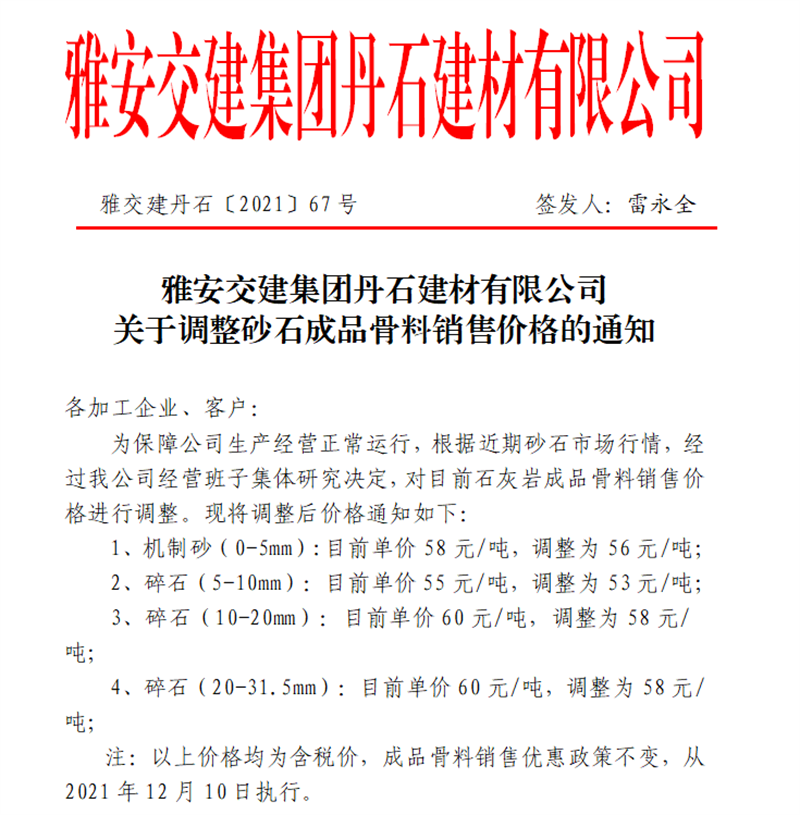 ÑŰ²½»½¨¼¯ˆFµ¤Ê¯¹«Ë¾êP(gu¨¡n)ÓÚÕ{(di¨¤o)Õûɰʯ³ÉÆ·¹ÇÁÏäNÊÛƒr¸ñµÄ֪ͨ£¨2021.12.9£©