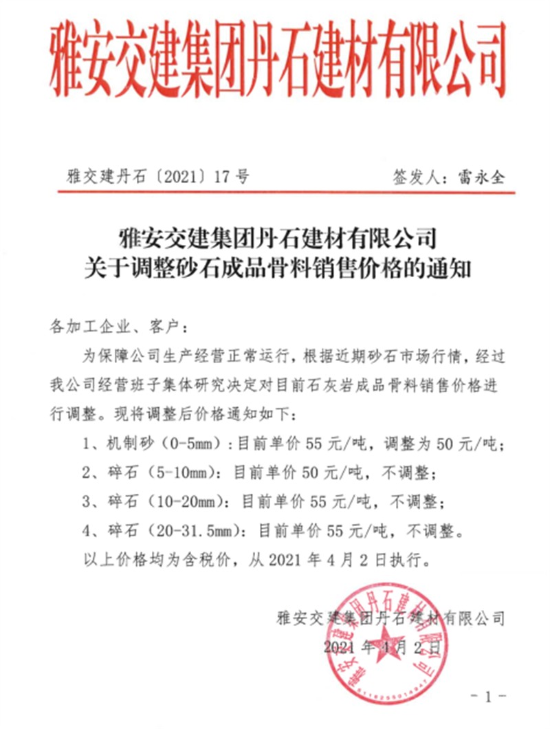 雅安交建集團(tuán)興寶公司砂石骨料銷售價(jià)格情況表(2021.2.28)