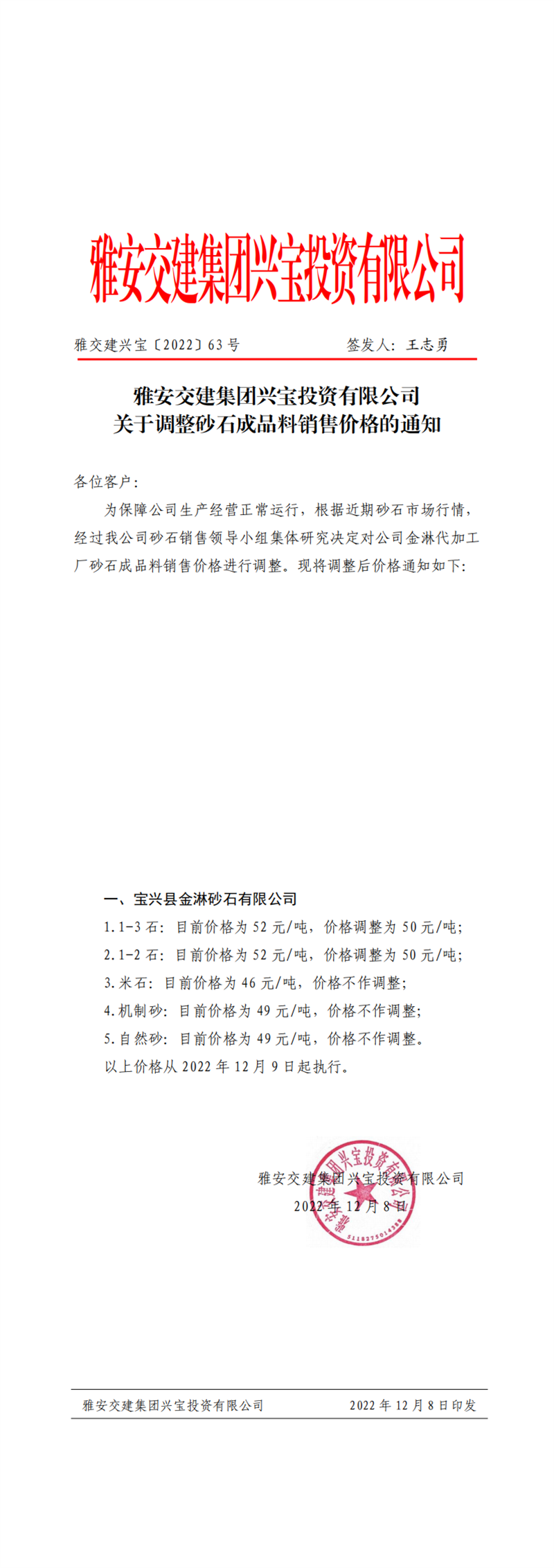 雅交建興寶〔2022〕63號 關于調(diào)整砂石成品料銷售價格的通知(2022-12-8)