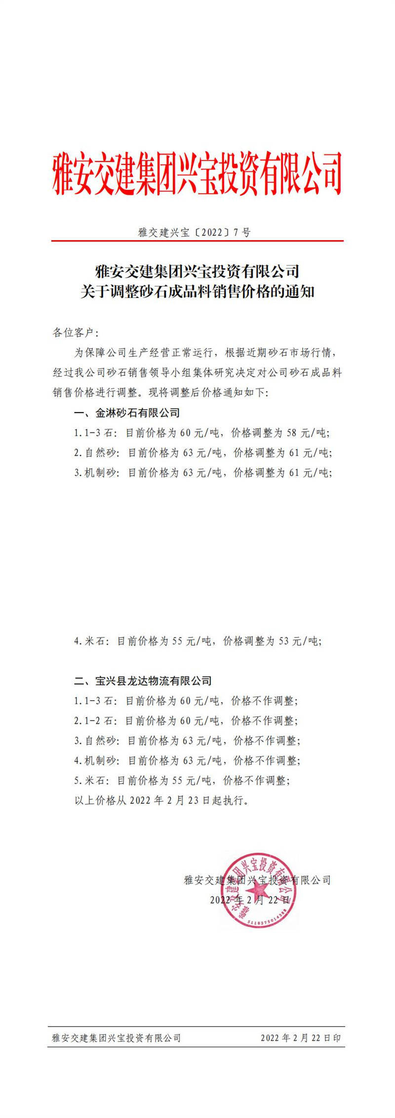 ÑŰ²½»½¨¼¯ˆF(tu¨¢n)ÅdŒšÍ¶ÙYÓÐÏÞ¹«Ë¾ êP(gu¨¡n)ÓÚÕ{(di¨¤o)Õûɰʯ³ÉÆ·ÁÏäN(xi¨¡o)ÊÛƒr(ji¨¤)¸ñµÄ֪ͨ£¨2022-2-23£©