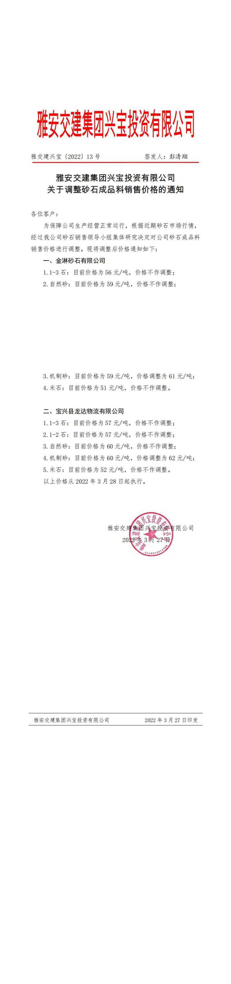雅交建興寶〔2022〕13號 關于調整砂石成品料銷售價格的通知-3月27日