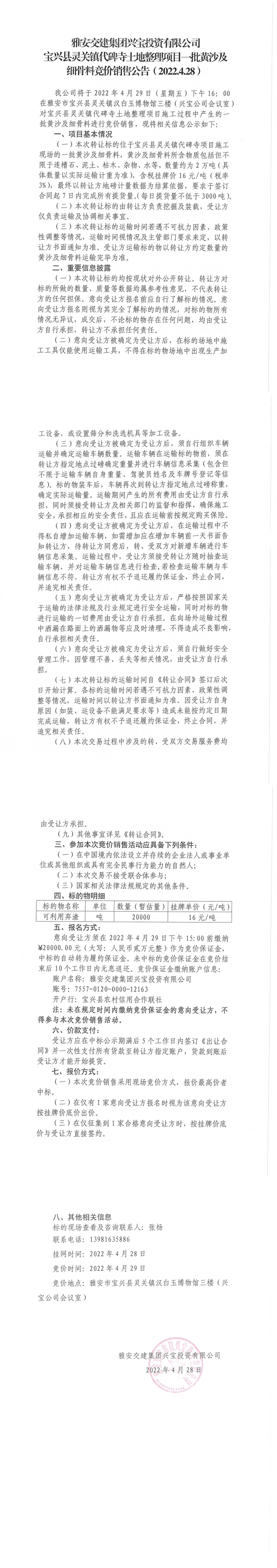 雅安交建集團(tuán)興寶投資有限公司寶興縣靈關(guān)鎮(zhèn)代碑寺土地整理項(xiàng)目一批黃沙及細(xì)骨料競(jìng)價(jià)銷售公告(2022.4.28)