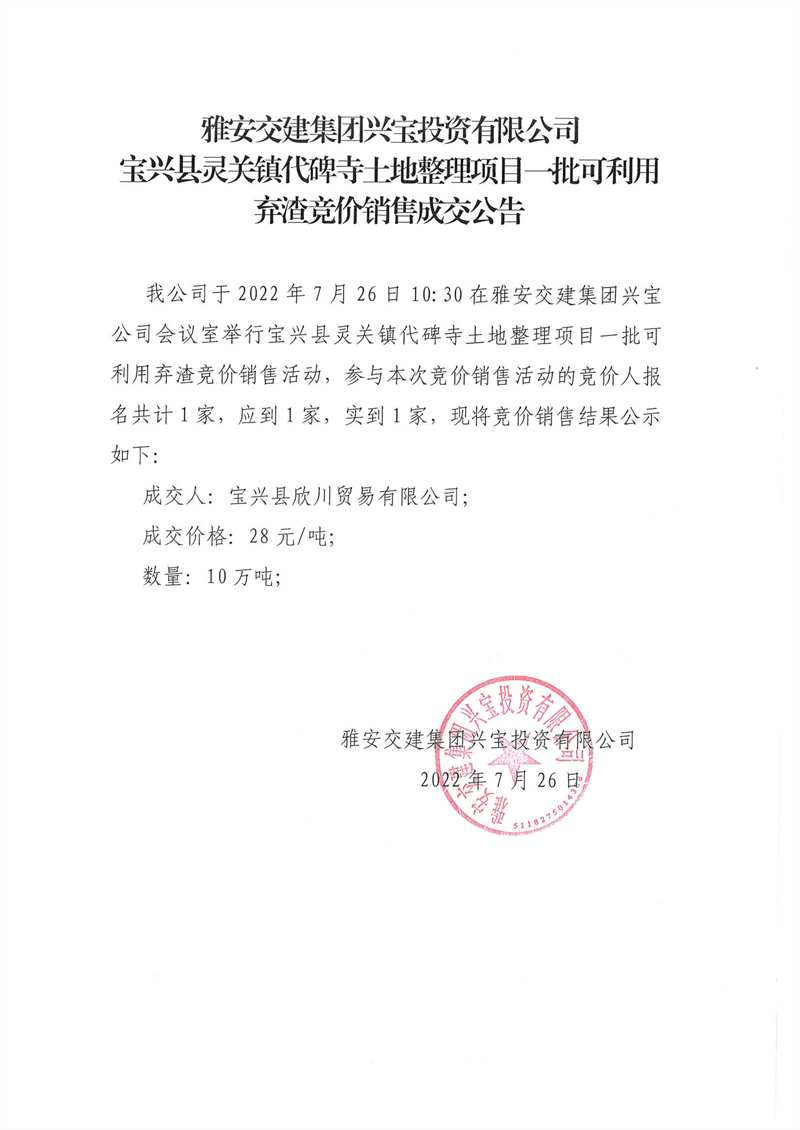 寶興縣靈關(guān)鎮(zhèn)代碑寺土地整理項(xiàng)目一批可利用棄渣競(jìng)價(jià)銷售成交公告7.26(10萬(wàn)噸)