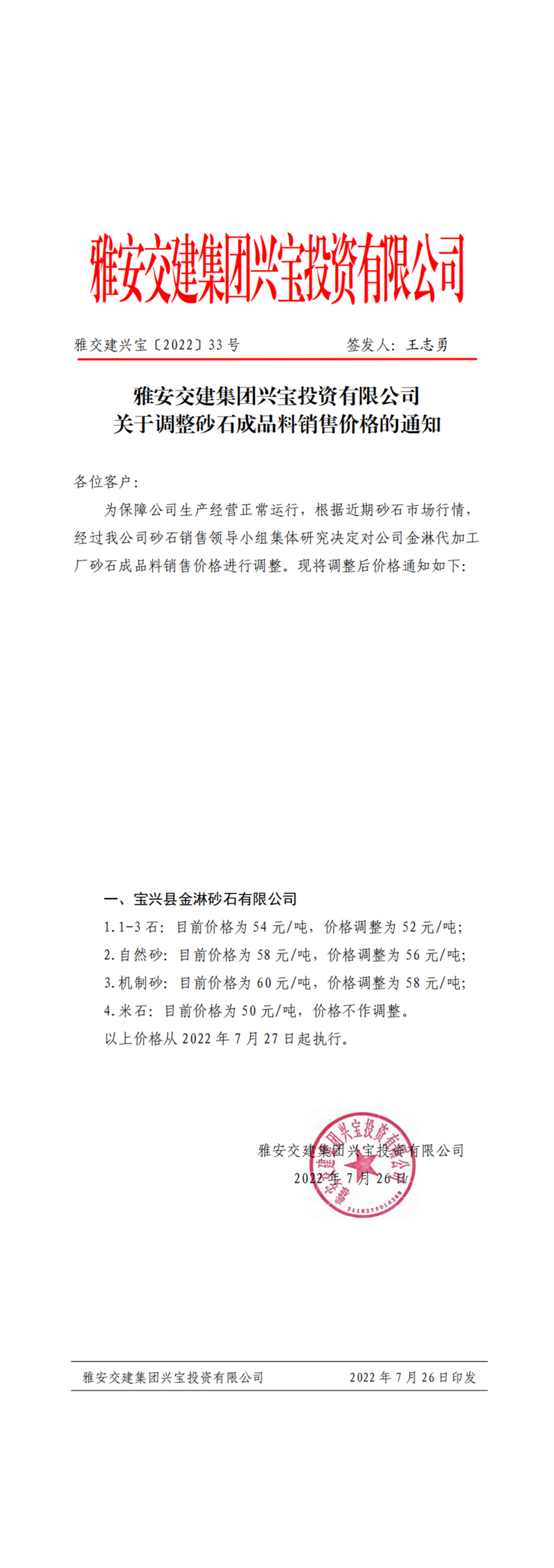 雅交建興寶〔2022〕33號(hào) 關(guān)于調(diào)整砂石成品料銷(xiāo)售價(jià)格的通知--7.27