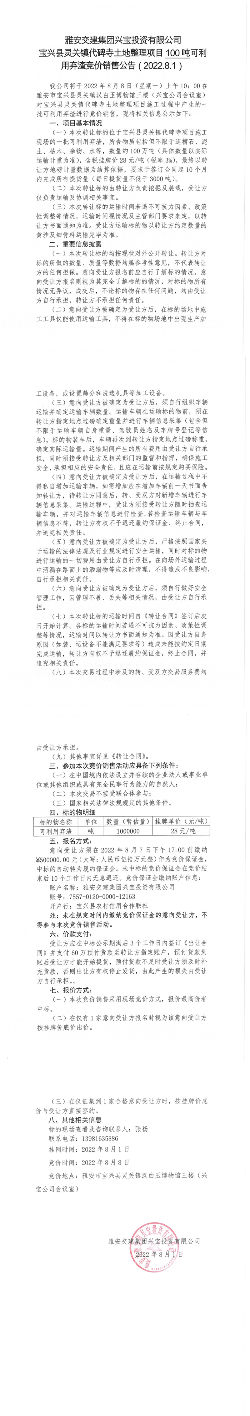 雅安交建集團(tuán)興寶投資有限公司靈關(guān)鎮(zhèn)代碑寺土地整理項(xiàng)目100萬噸可利用棄渣競價(jià)銷售公告(2022.8.1)