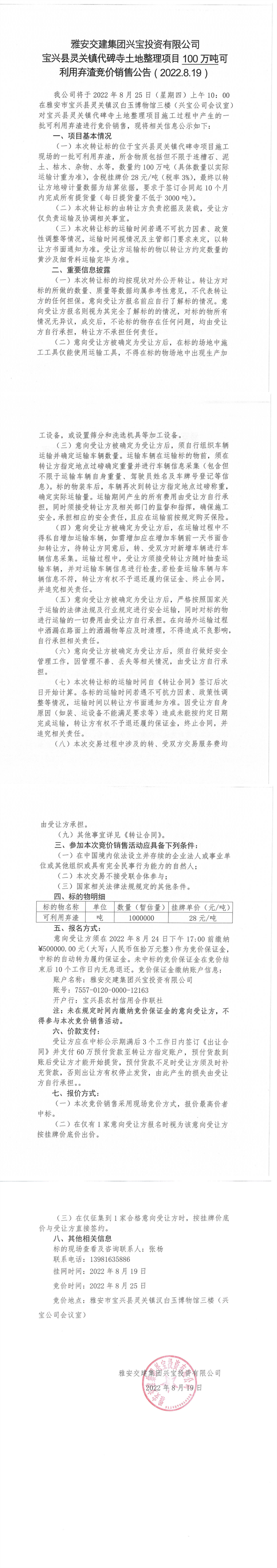 雅安交建集團(tuán)興寶投資有限公司靈關(guān)鎮(zhèn)代碑寺土地整理項(xiàng)目10萬噸可利用棄渣競(jìng)價(jià)銷售公告(2022.8.19)(1)