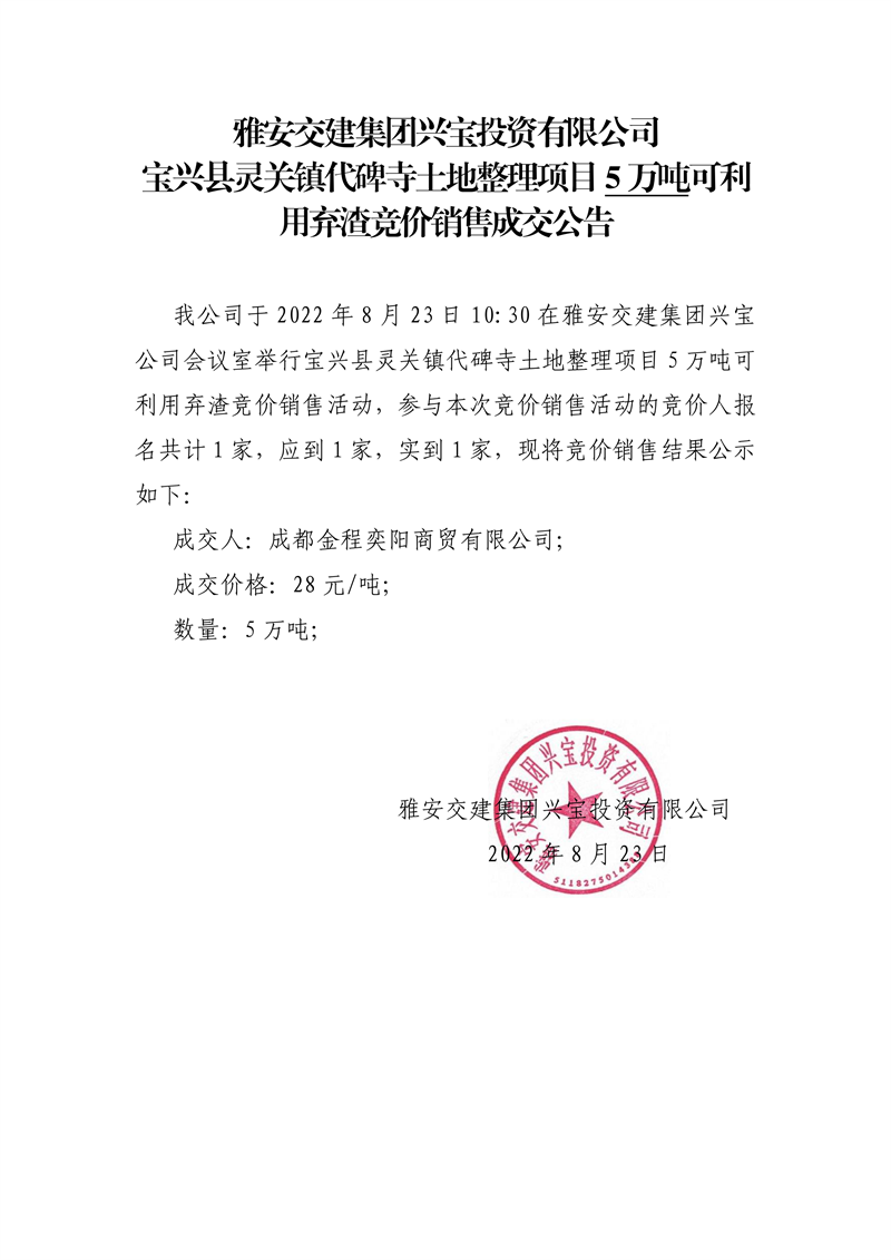 雅安交建集團(tuán)興寶投資有限公司寶興縣靈關(guān)鎮(zhèn)代碑寺土地整理項(xiàng)目10萬噸可利用棄渣競價銷售成交公告(8.23)
