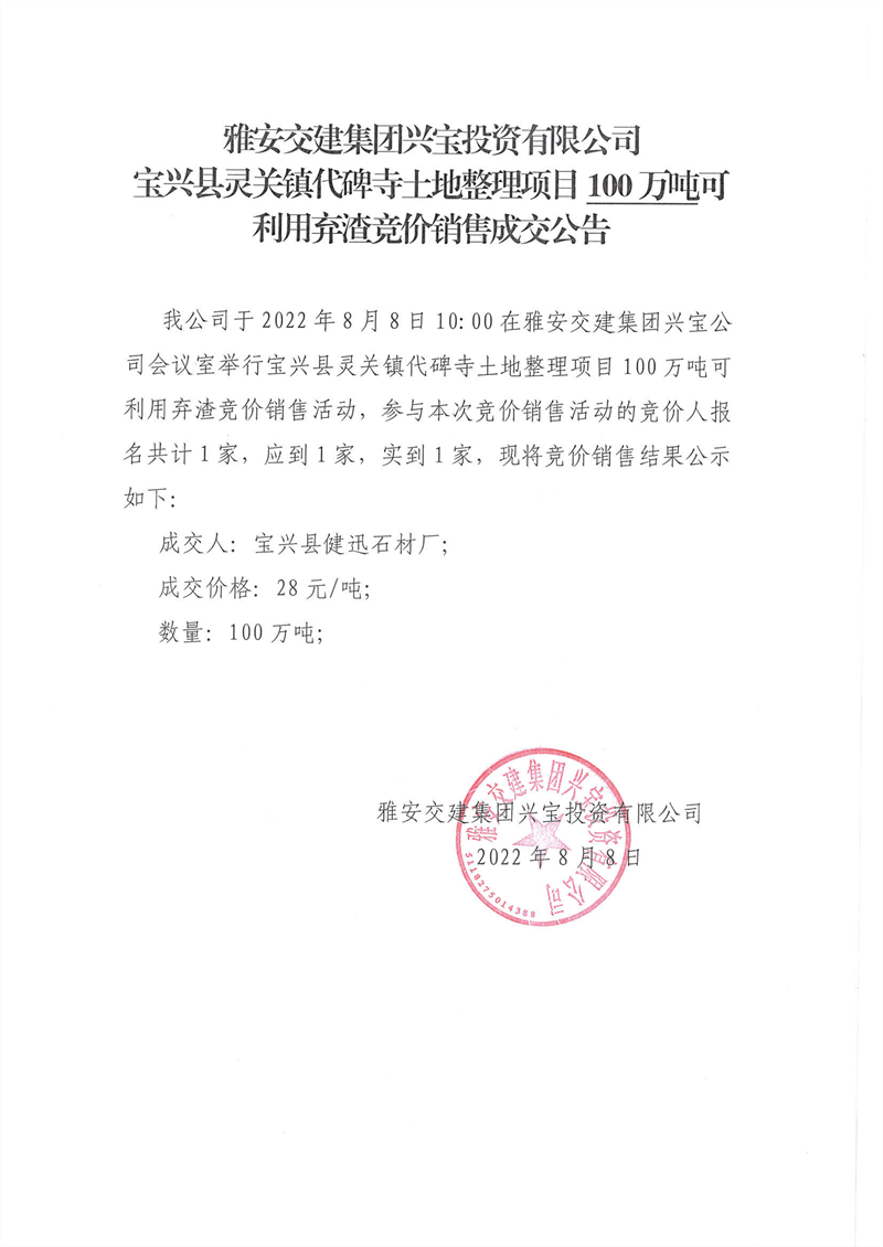 代碑寺土地整理項(xiàng)目100萬噸可利用棄渣競價銷售成交公告