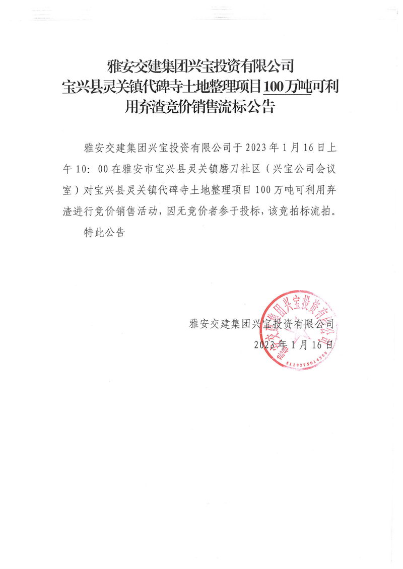 雅安交建集團興寶投資有限公司100萬噸可利用棄渣競價銷售流標公告(2023.1.16)