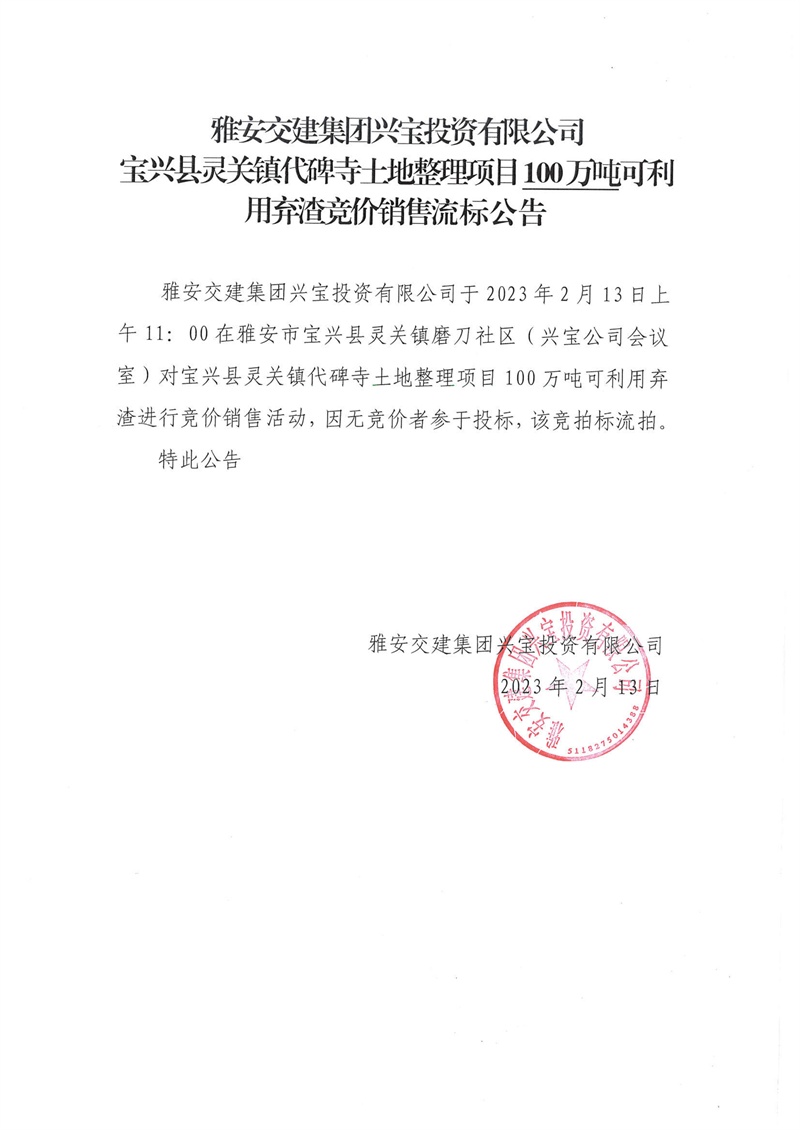 雅安交建集團(tuán)興寶投資有限公司100萬(wàn)噸可利用棄渣競(jìng)價(jià)銷售流標(biāo)公告(2023.2.13)