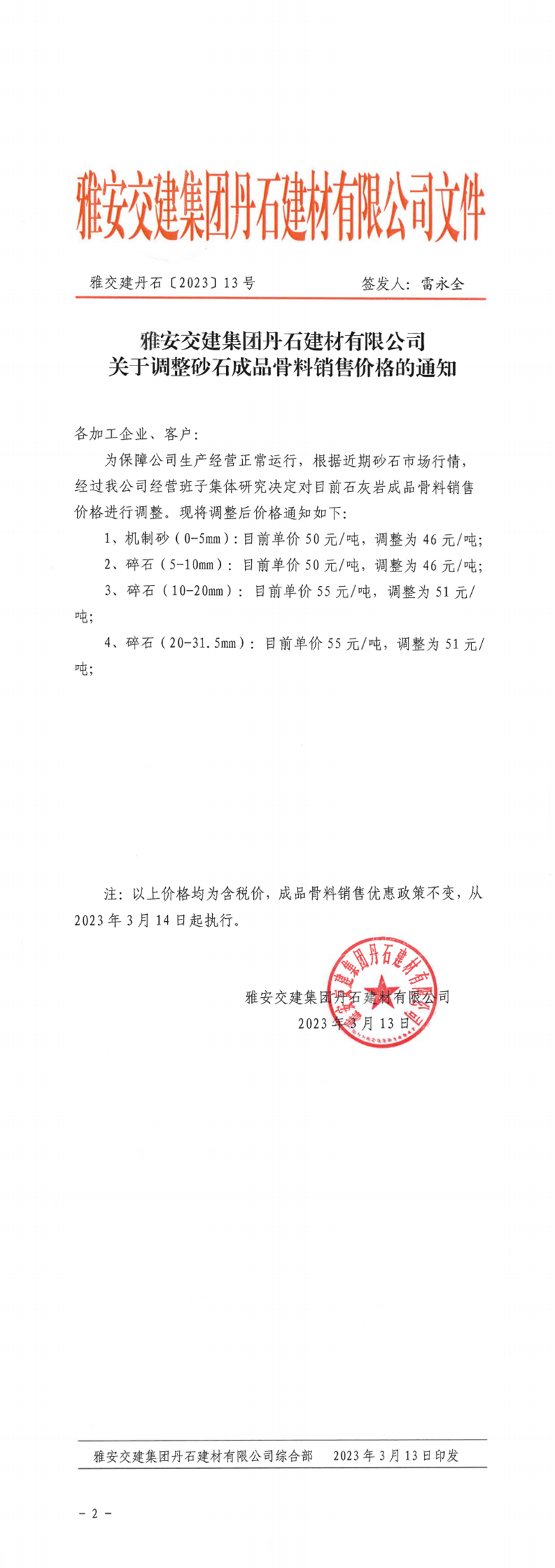 雅安交建集團興寶投資有限公司關于調(diào)整成品料價格的通知(2023.03.13)