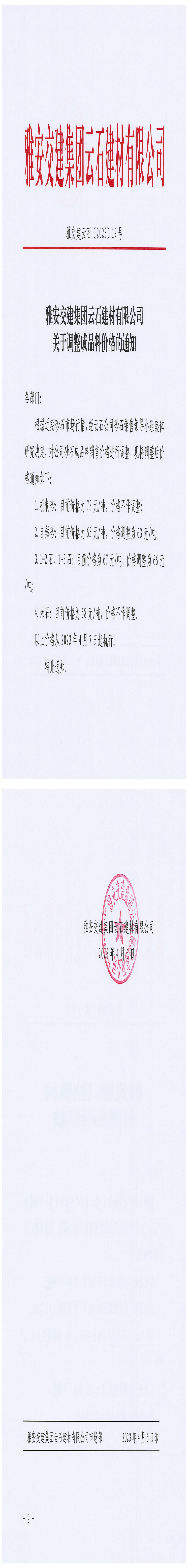 雅安交建集團云石建材有限公司關于調(diào)整成品料價格的通知(2023-4-6)