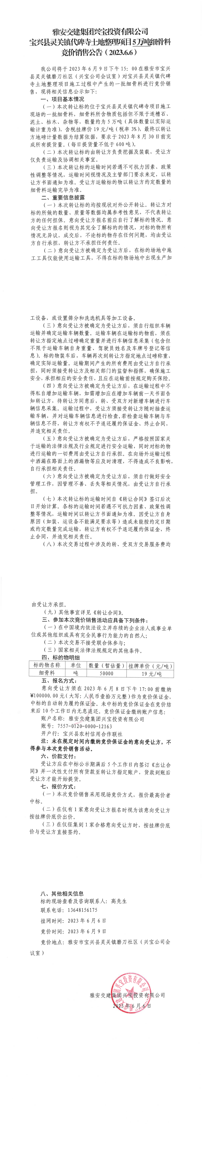 雅安交建集團(tuán)興寶投資有限公司寶興縣靈關(guān)鎮(zhèn)代碑寺土地整理項(xiàng)目5萬(wàn)噸細(xì)骨料競(jìng)價(jià)銷售公告(2023.6.6)