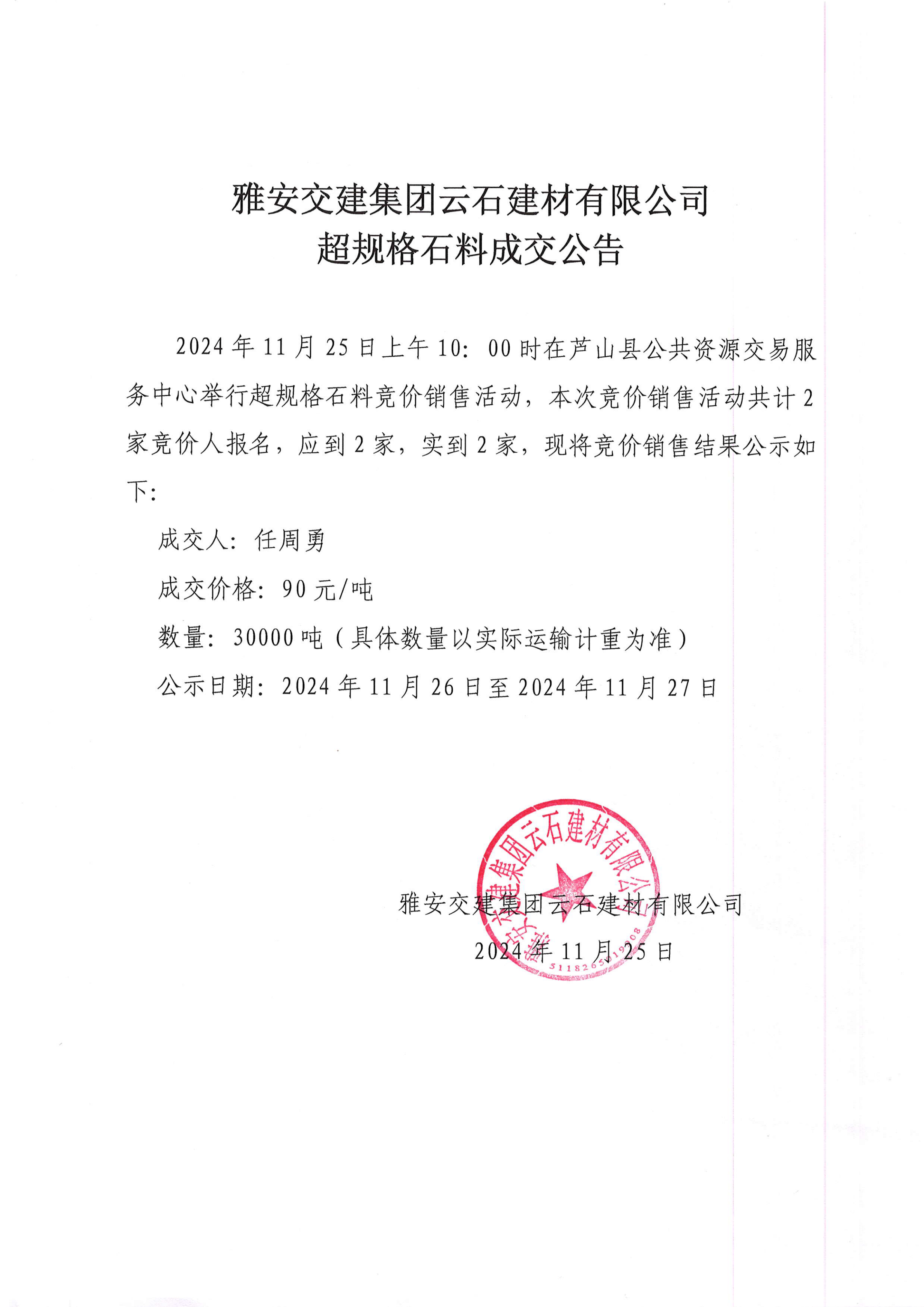 ÑŰ²½»½¨¼¯ˆFÔÆÊ¯½¨²ÄÓÐÏÞ¹«Ë¾³¬ÒŽ(gu¨©)¸ñʯÁϸ‚ƒräNÊ۳ɽ»¹«¸æ£¨2024-11-26£©