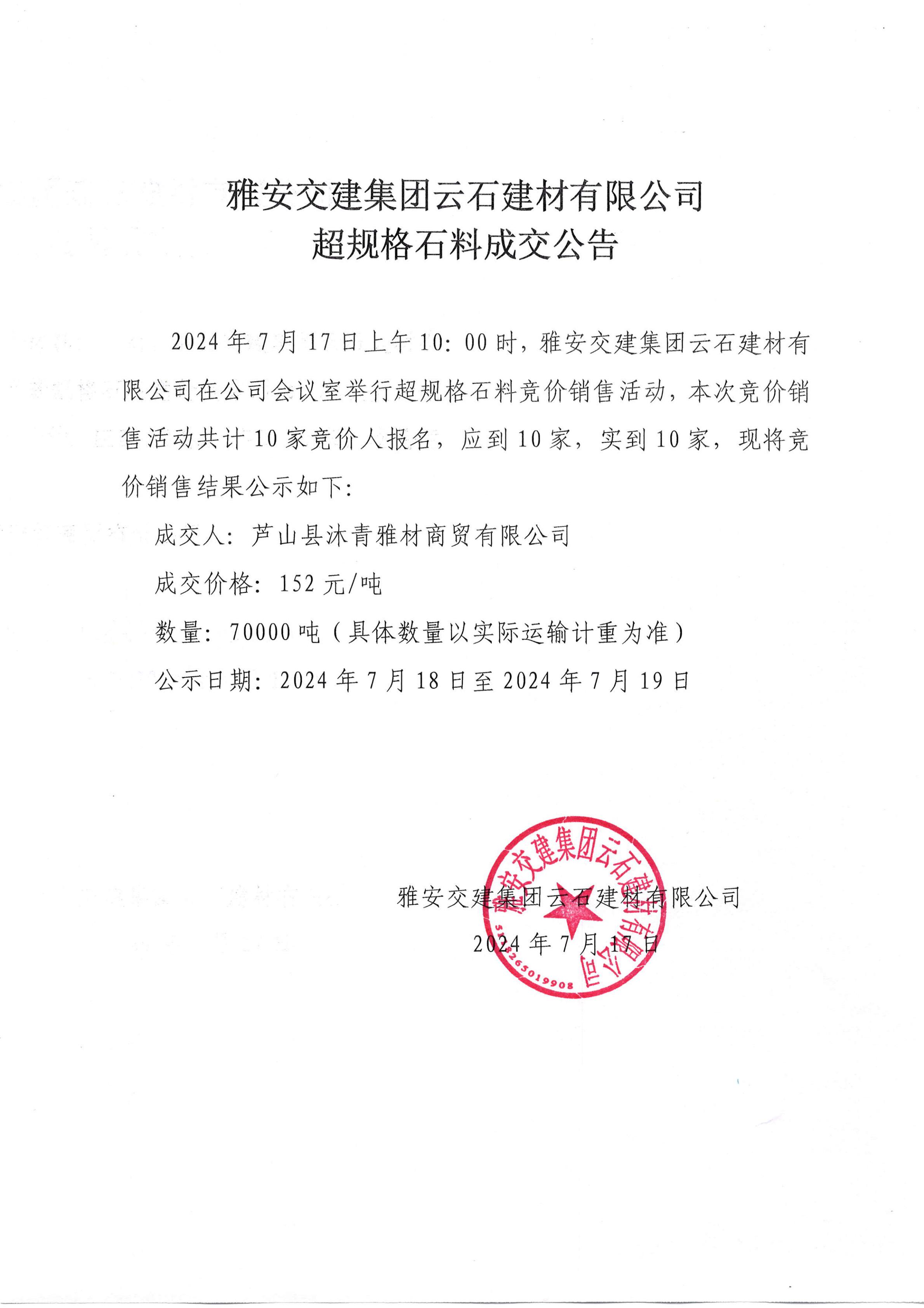雅安交建集團(tuán)云石建材有限公司 超規(guī)格石料成交公告(2024.7.17)