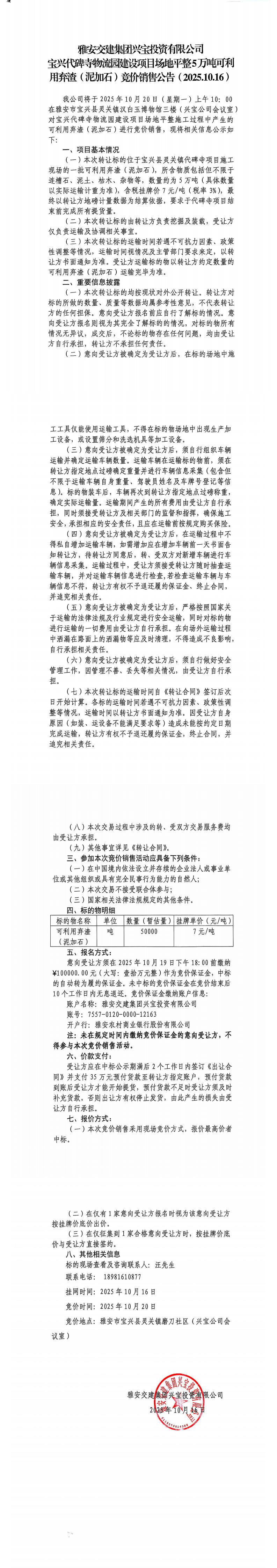 雅安交建集團興寶投資有限公司寶興代碑寺物流園建設項目場地平整5萬噸可利用棄渣(泥加石)競價銷售公告(2025.10.16)